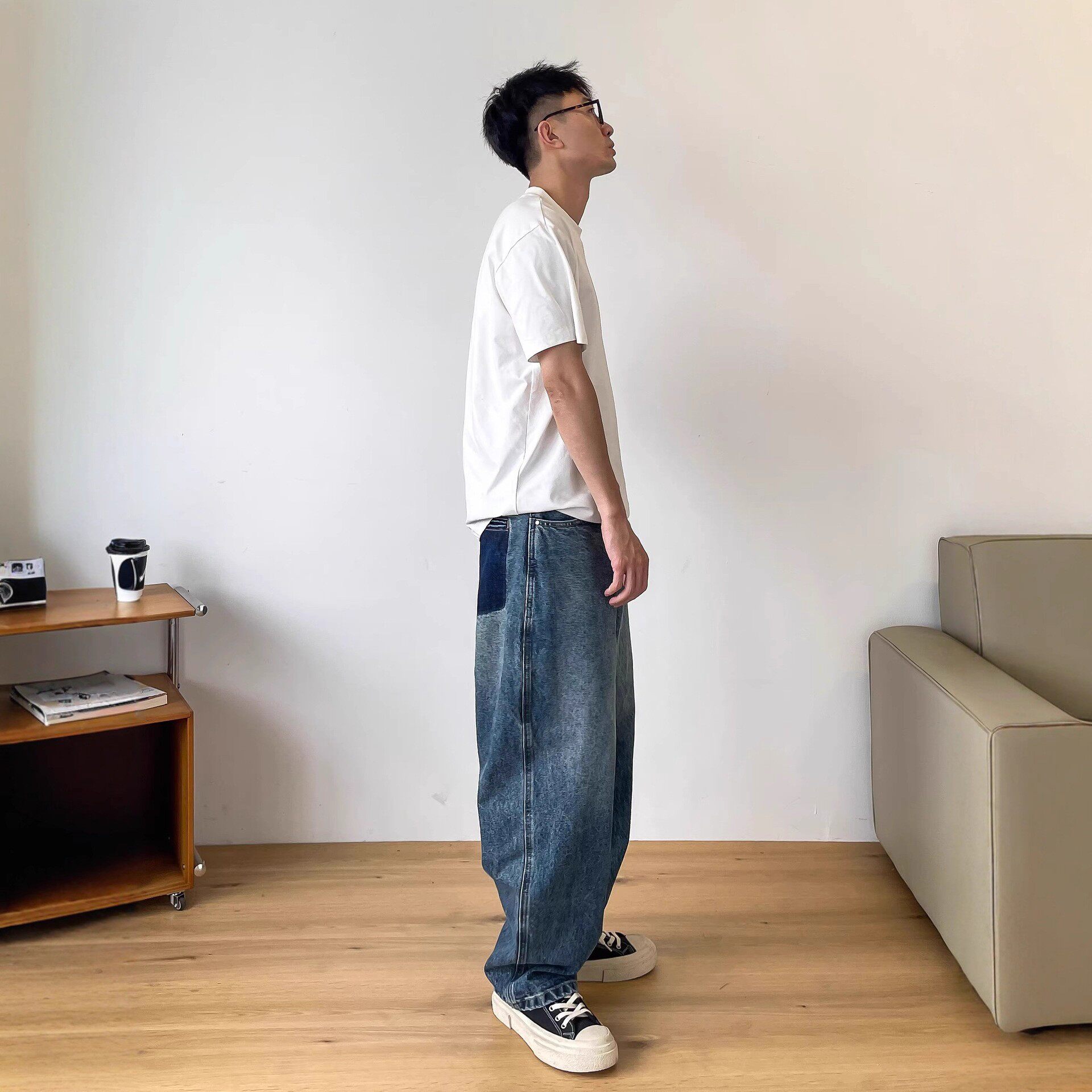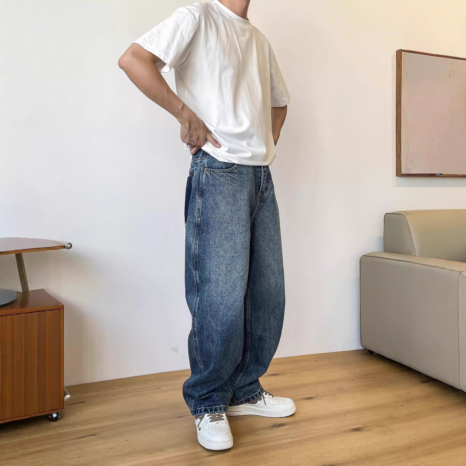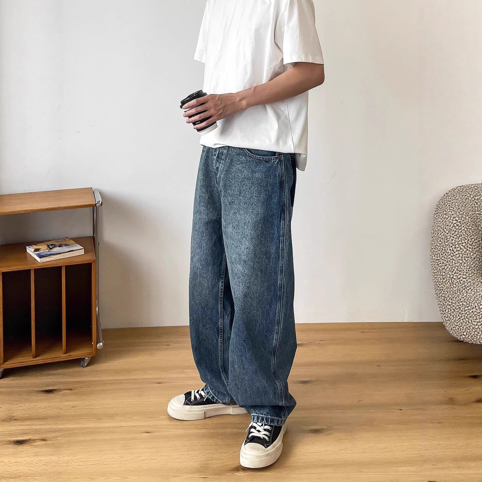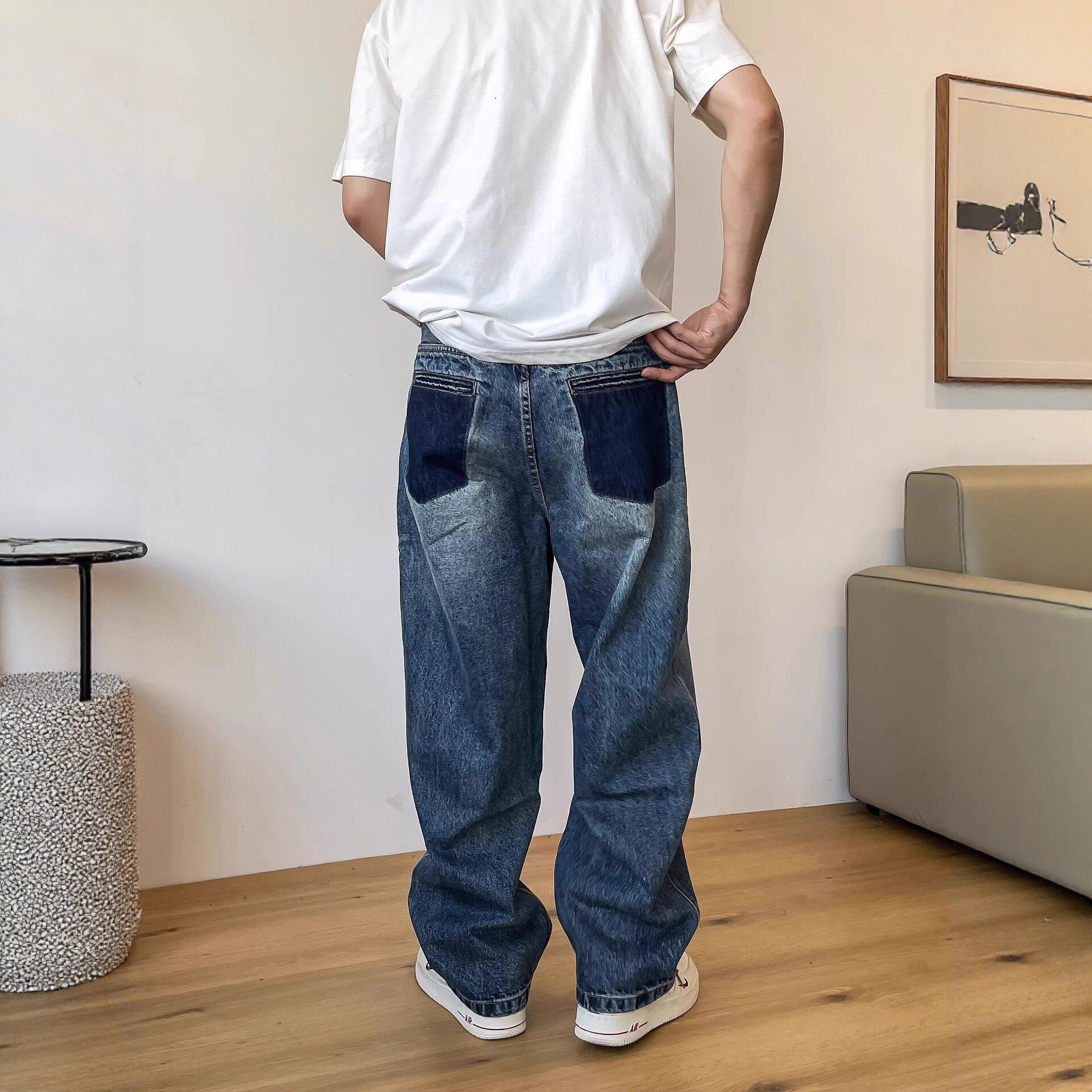 休闲做旧口袋宽松直筒牛仔长裤