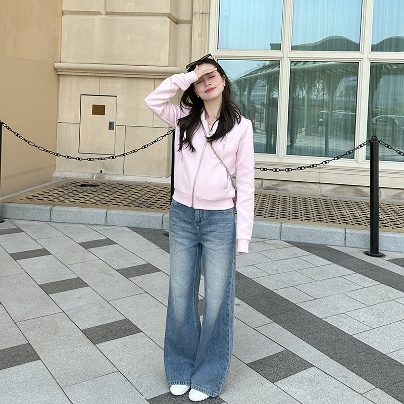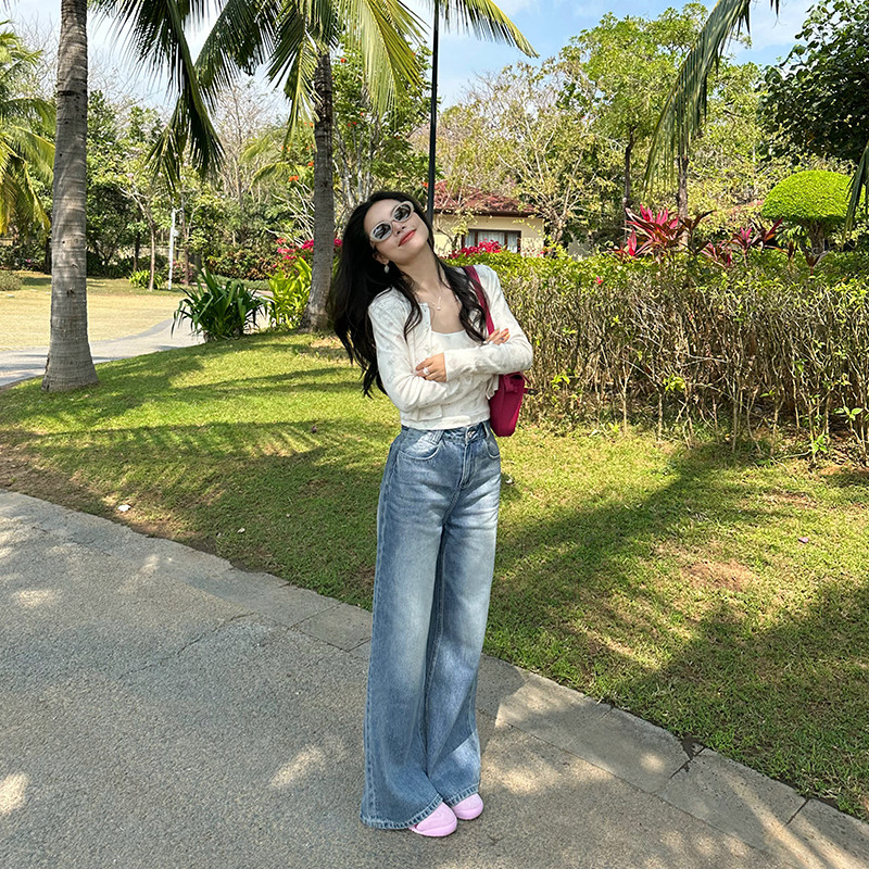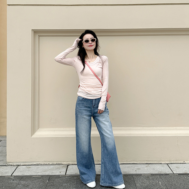 复古水洗蓝色微喇牛仔裤