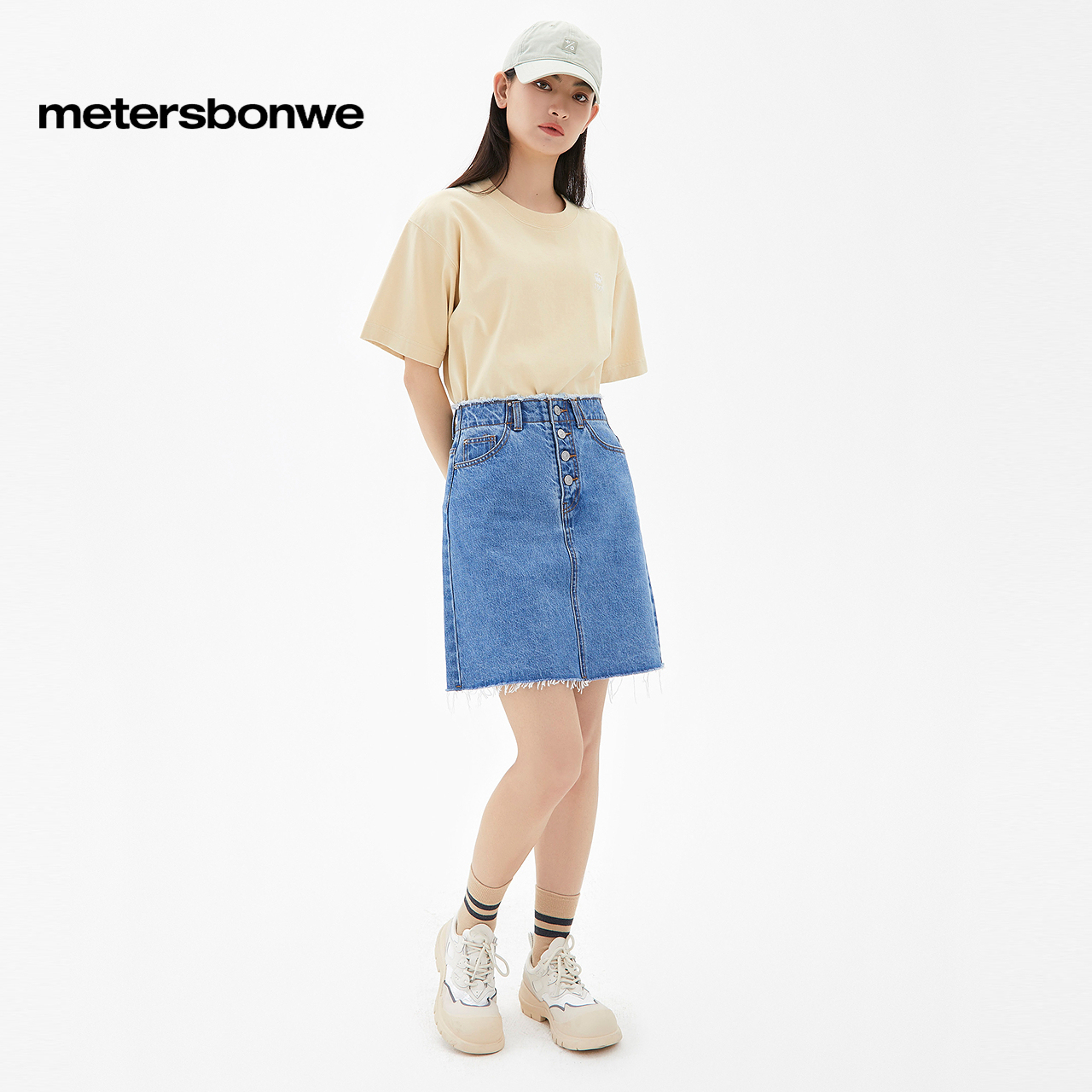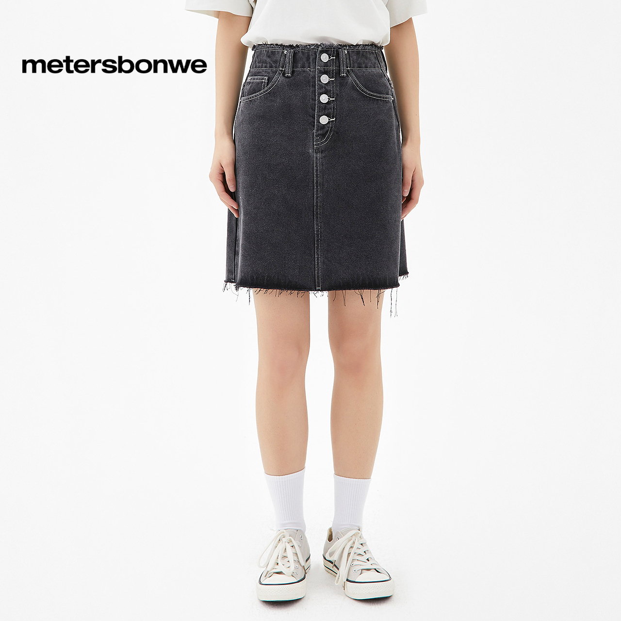 美特斯邦威牛仔半身裙女春秋时尚纯色排扣洗水毛边修身性感短裙子