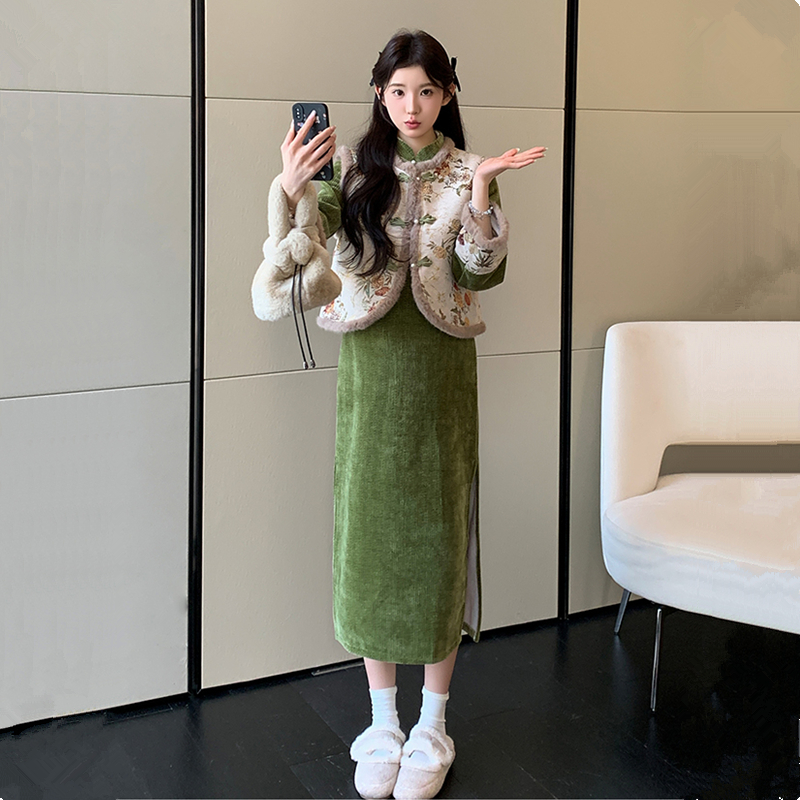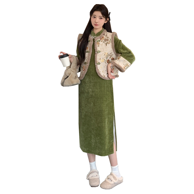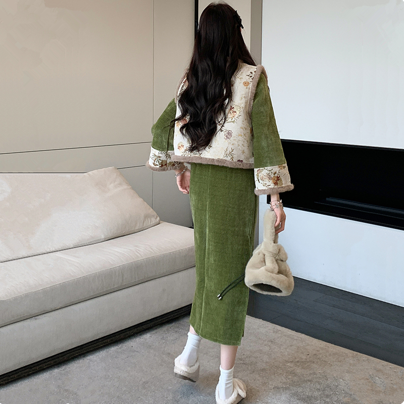 孕妇旗袍连衣裙秋冬裙子套装2025新款毛绒绣花马甲复古国风长裙子
