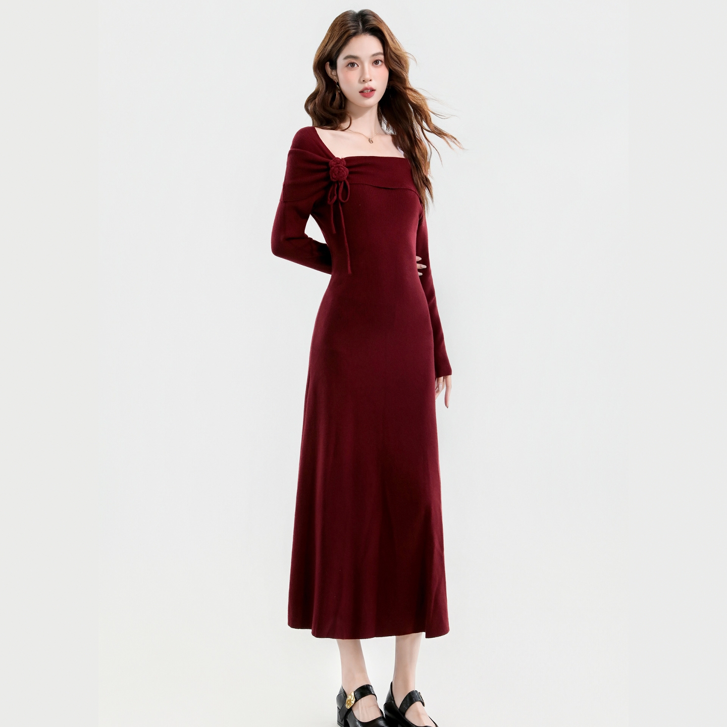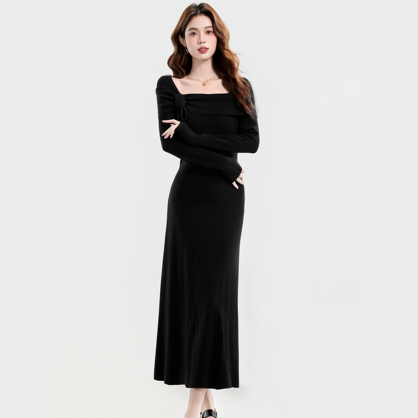 长款针织连衣裙女轻奢高级感法式方领优雅气质显瘦打底毛衣裙过膝