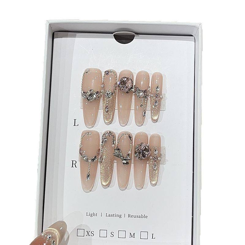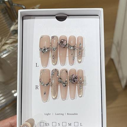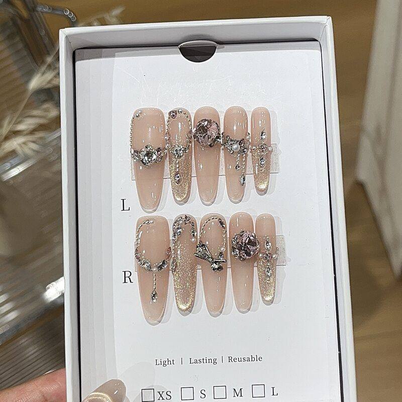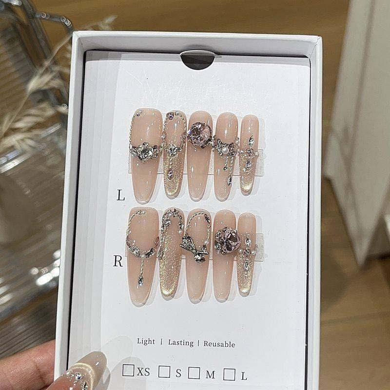 轻奢绵绵桃露温柔甜欲冰透感粉金色猫眼链条珍珠贴钻贵气穿戴甲