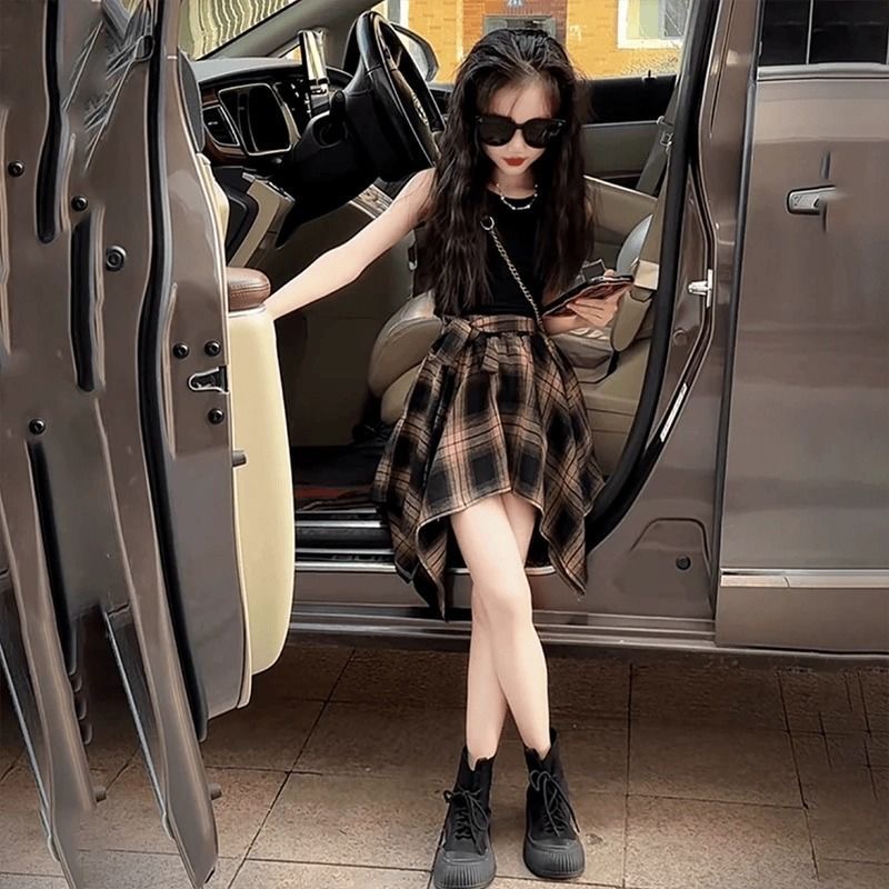 女童个性露背背心不规则格子半身裙套装2025夏款中大童裙裤甜酷风