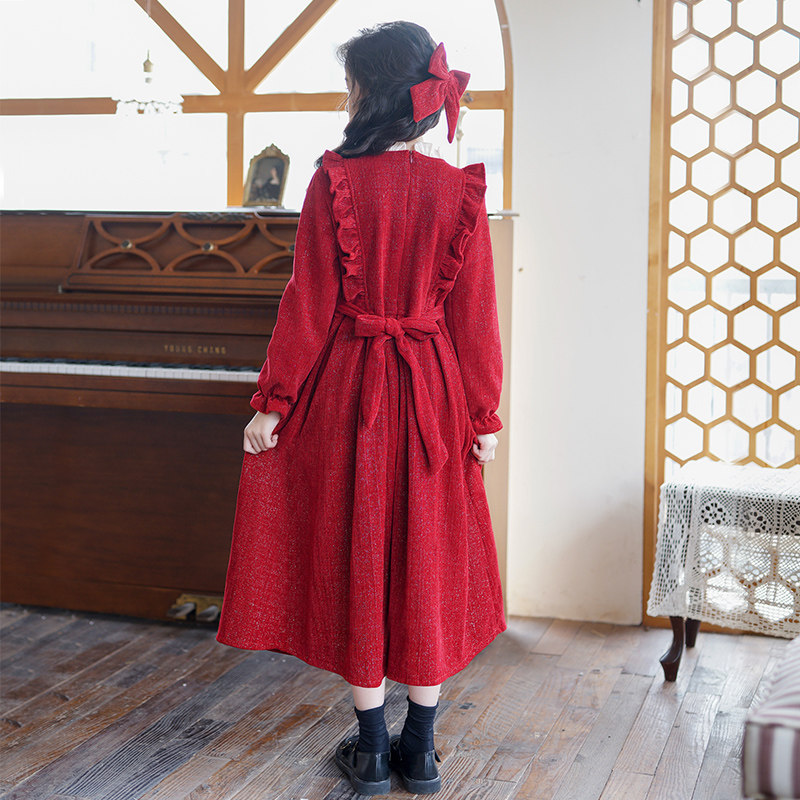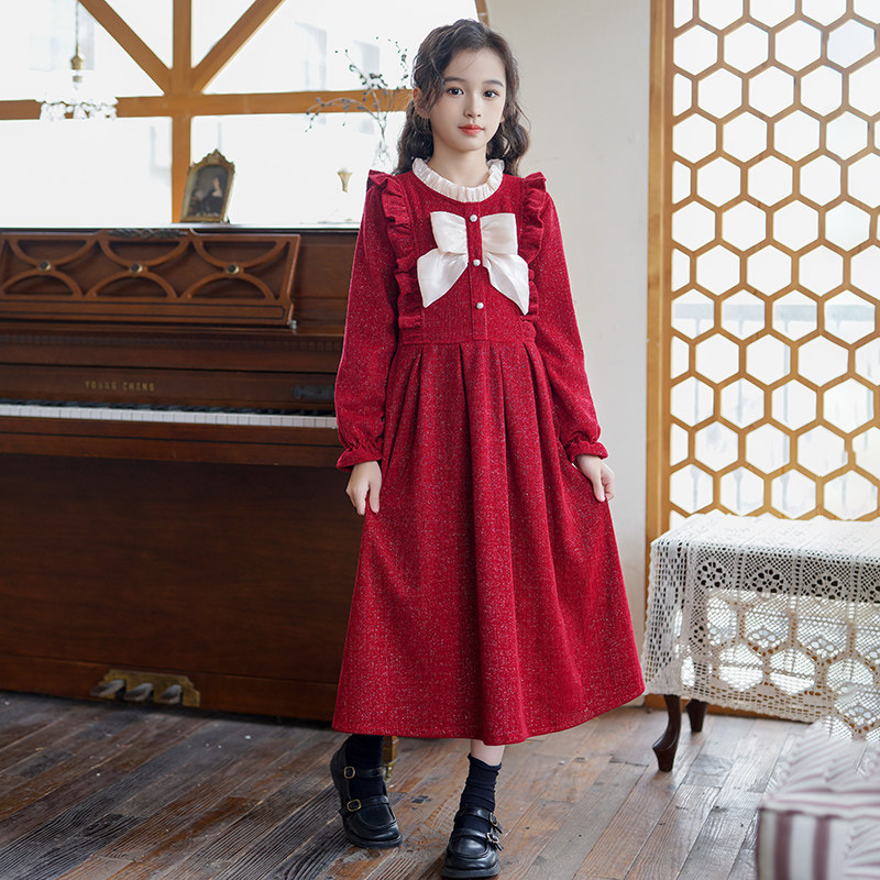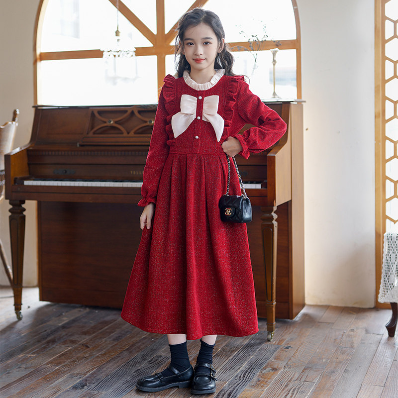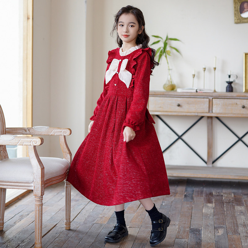 中大女童红色连衣裙2025新款洋气加绒长袖蝴蝶结公主裙子韩版秋冬