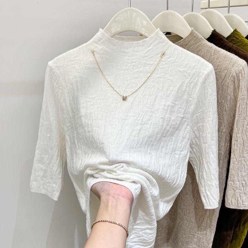 春秋薄款半高领针织打底衫女2024新款五分袖洋气中袖内搭上衣