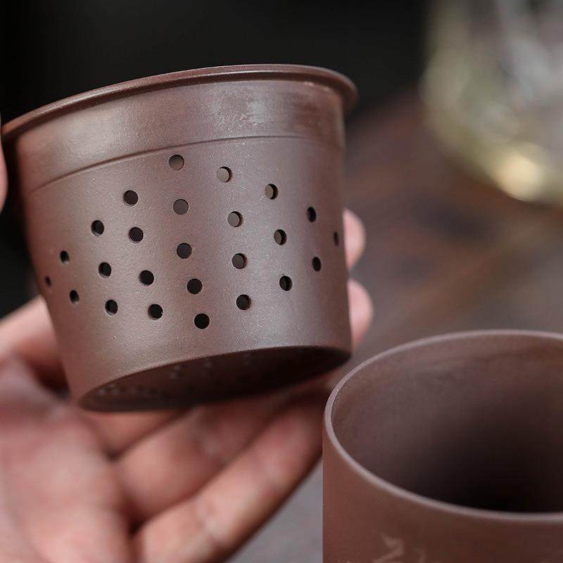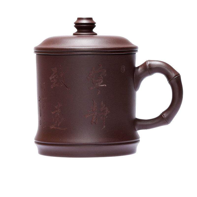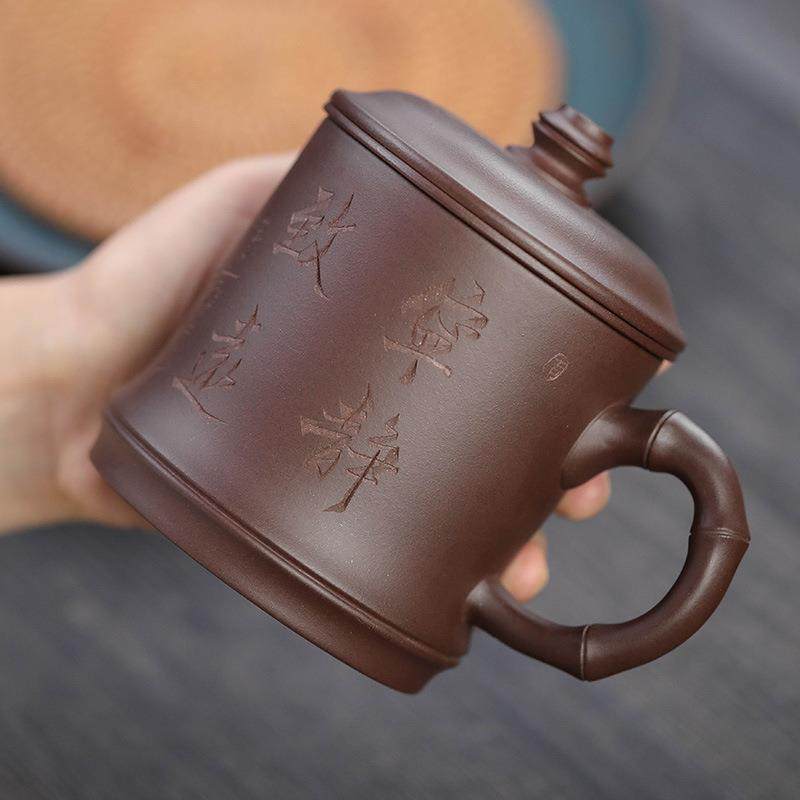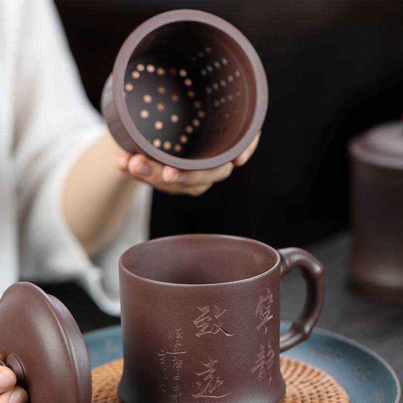 紫砂茶杯宜兴原矿手工陶刻厚德载物带过滤芯竹节盖杯办公泡茶杯