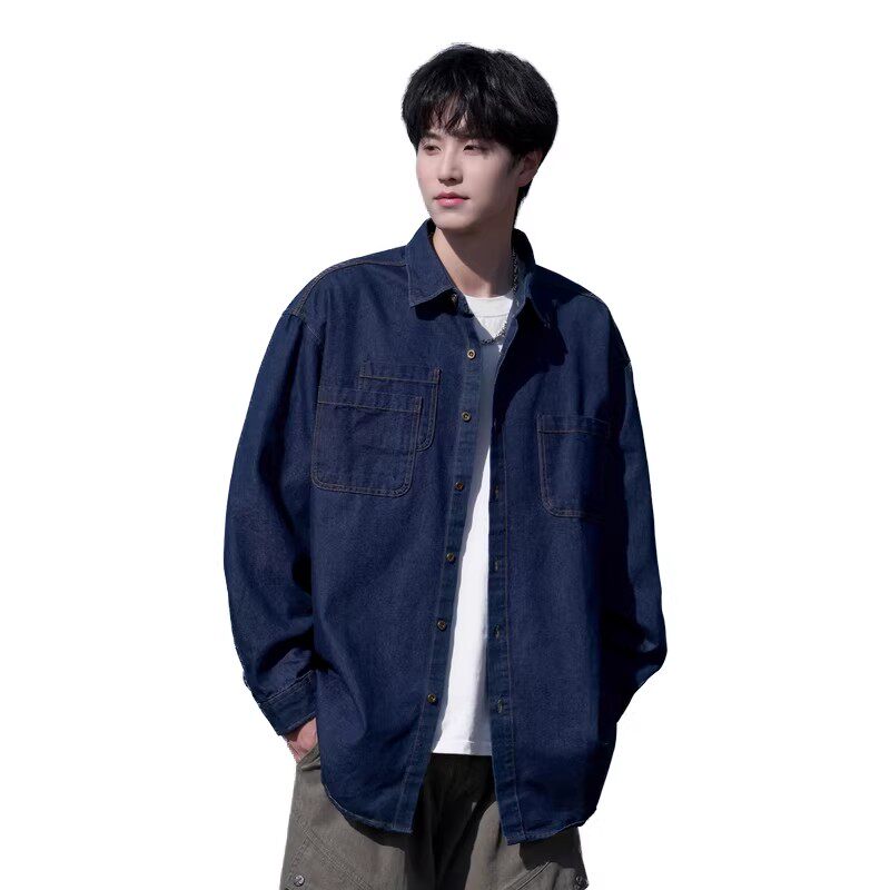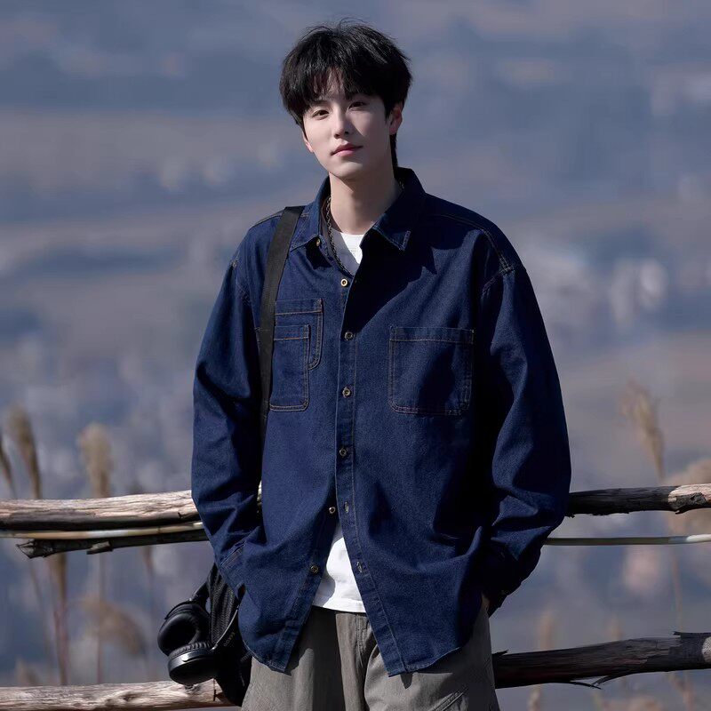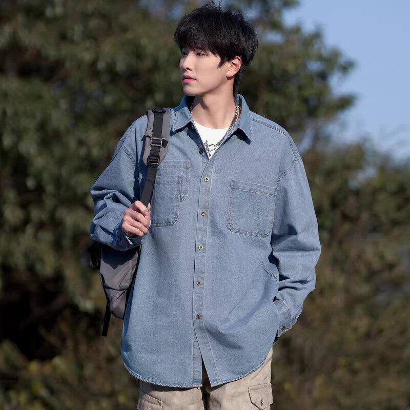 春季新款牛仔日系纹理寸衫高级感休闲宽松长袖潮牌衬衫外套夹克