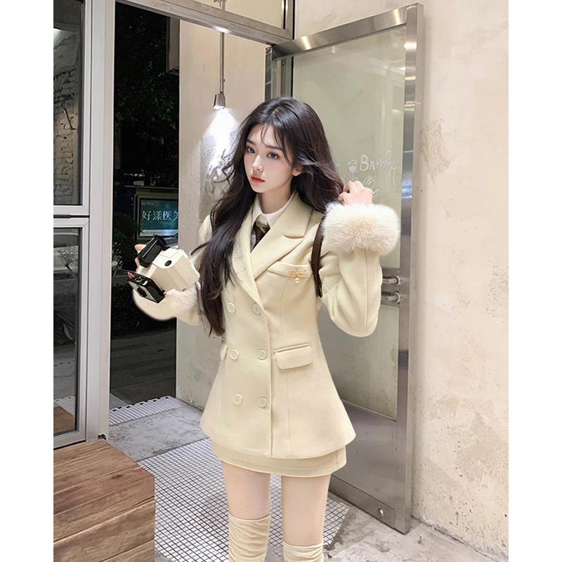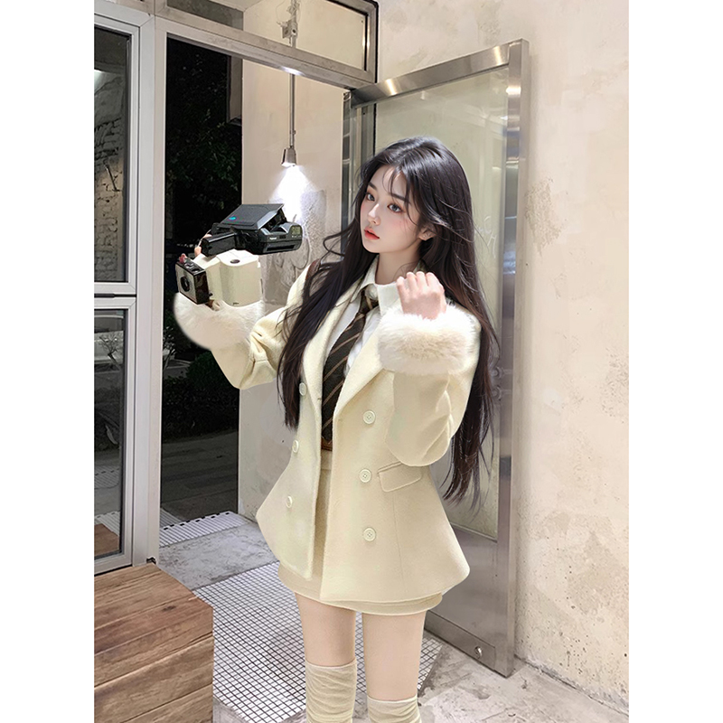 千金风小香毛呢套装收腰显瘦夹棉呢子毛毛外套+高腰显瘦半身裙