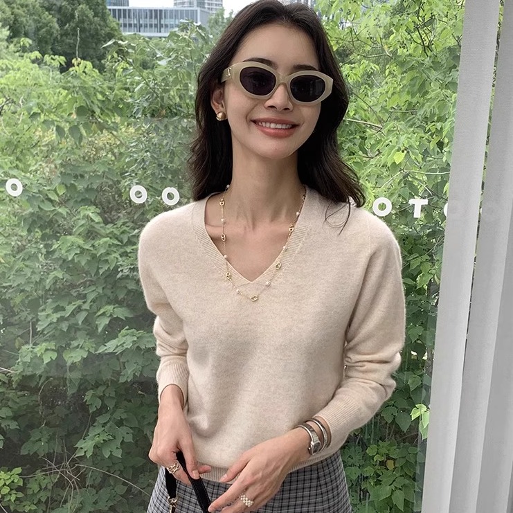 鄂尔多斯市无缝一体羊绒衫女V领秋冬套头宽松内搭针织打底羊毛衫