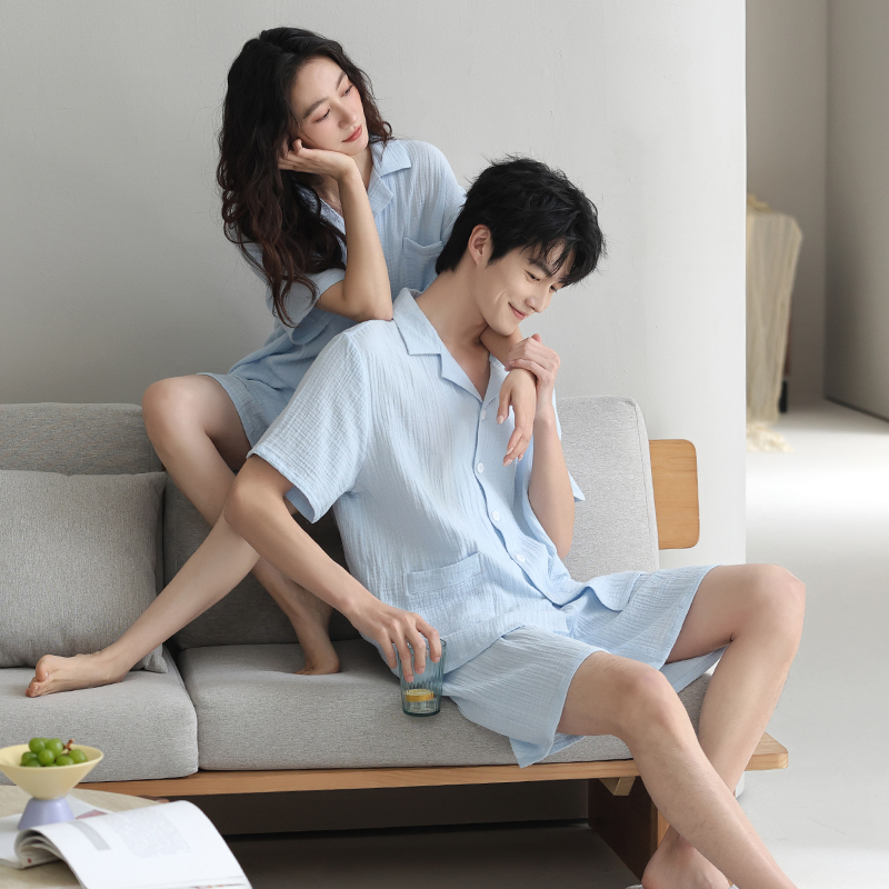 芬腾可安情侣睡衣女款2025新款夏短袖纯棉纱布短裤男士家居服套装