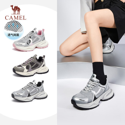 骆驼老爹鞋女2025秋季新款厚底时尚休闲鞋银色跑步运动鞋女