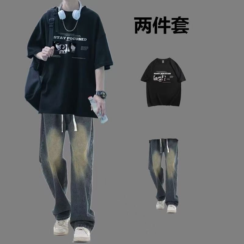 青少年短袖T恤夏季休闲运动套装痞帅ins宽松帅气牛仔裤男阔腿学生