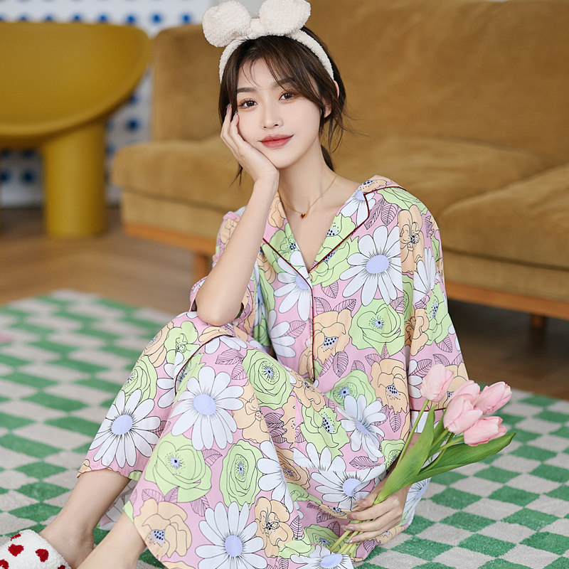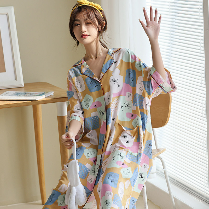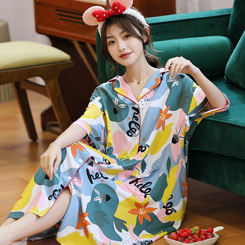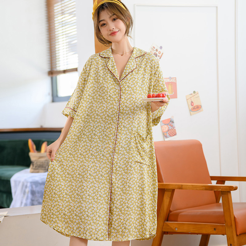 衬衫睡裙女春秋季短袖棉绸韩版开衫夏季人造棉长款性感宽松家居服