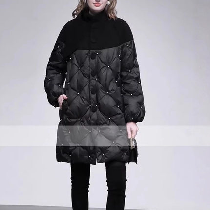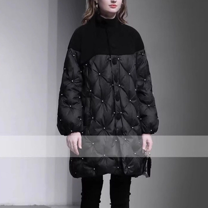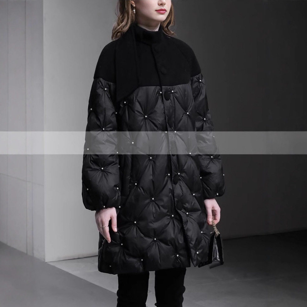 冬季新款时尚简约高领毛呢拼接长袖宽松中长钉珠羽绒服外套女