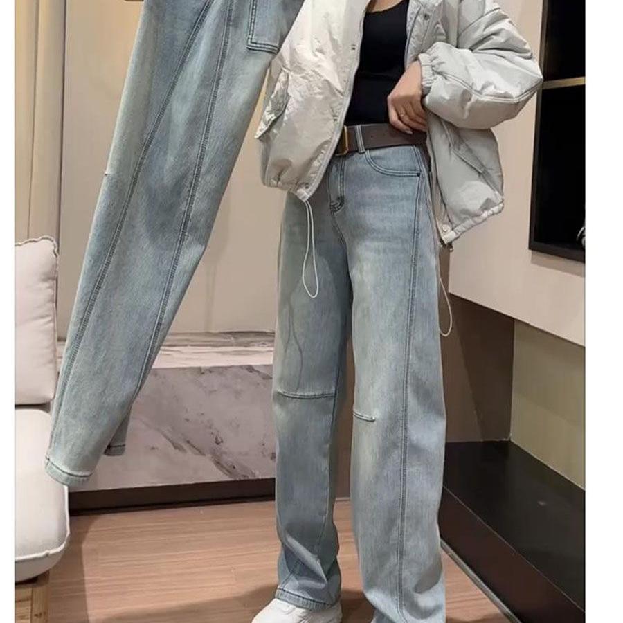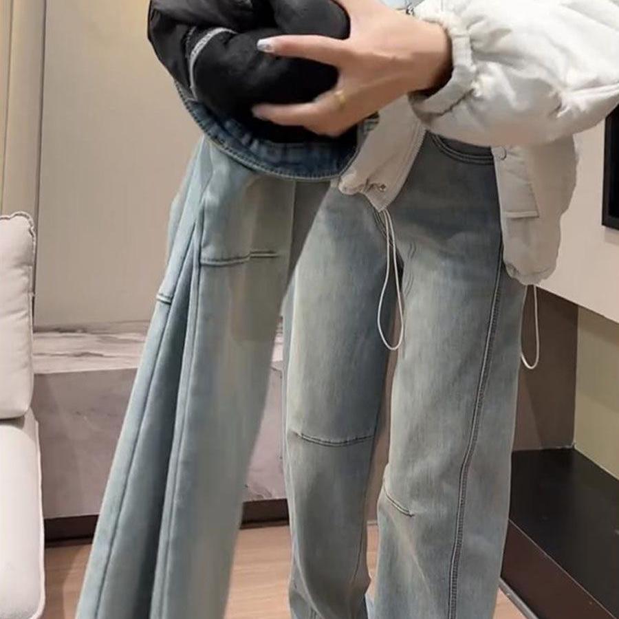 浅色加绒加厚弯刀牛仔裤女秋冬新款高腰显瘦窄版香蕉裤大码直筒裤