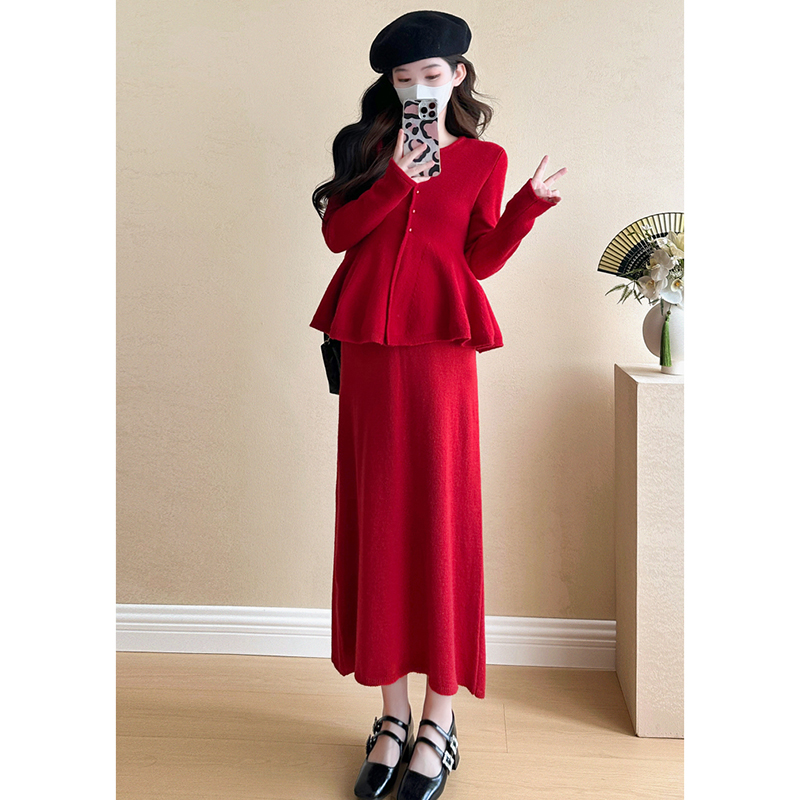 孕妇连衣裙套装秋冬洋气针织长袖毛衣半身裙2025新款过年红两件套