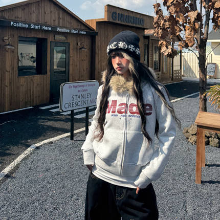 Amoeba美式复古毛领连帽卫衣拉链开衫字母印花秋季短款宽松外套女