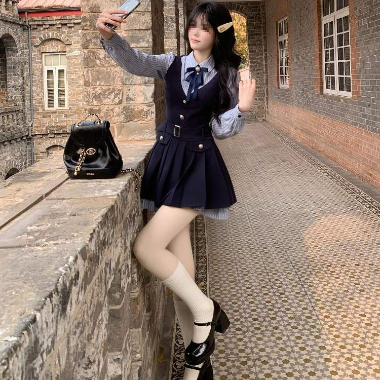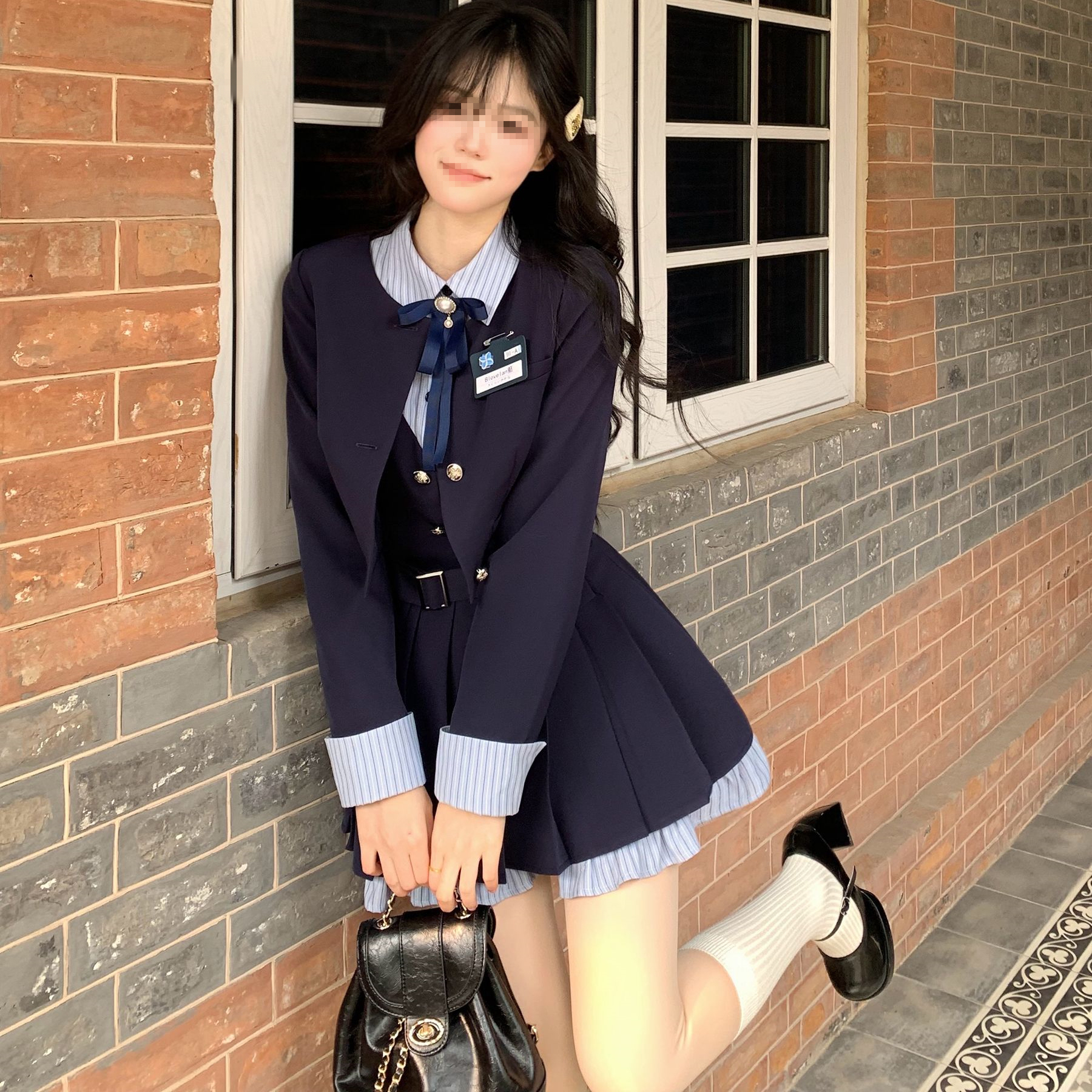 学院 jk制服polo领拼接短裙假两件百褶连衣裙西装外套两件套装夏