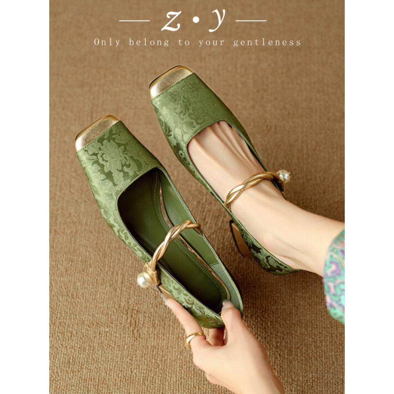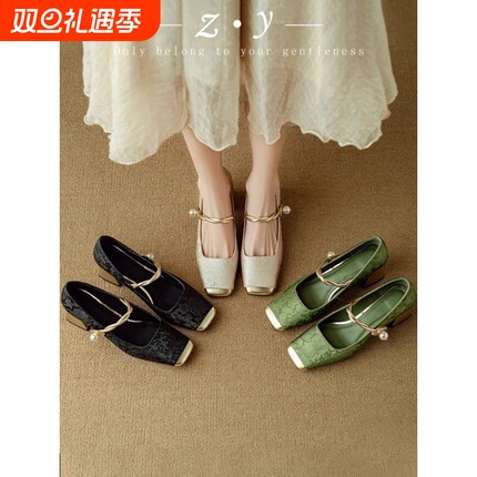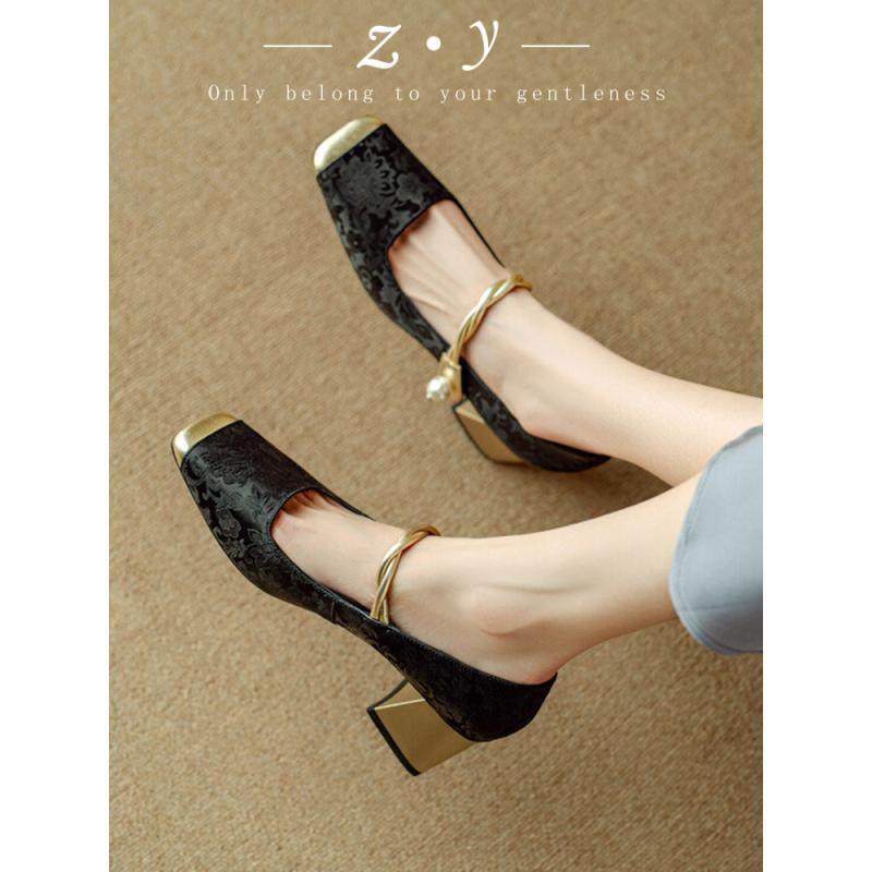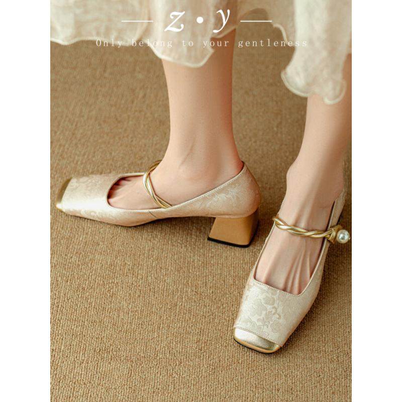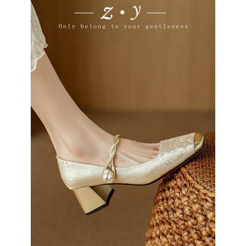 粗跟女中跟高跟鞋女2024新款夏季国潮单鞋新中式软皮方头鞋子浅口
