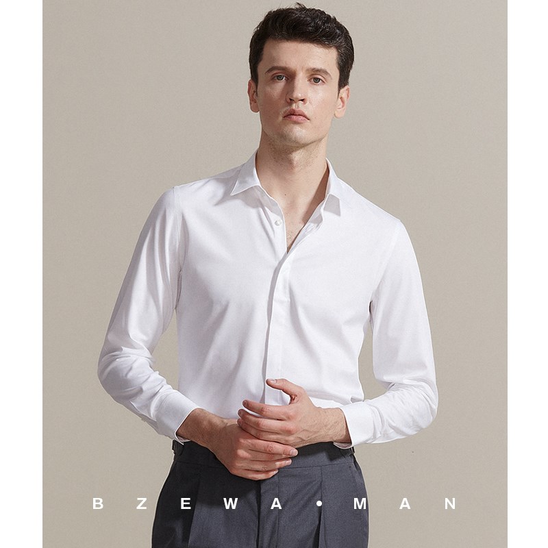 新款竹纤维弹力衬衫男长袖暗门襟修身免烫商务正装小领白色衬衣潮