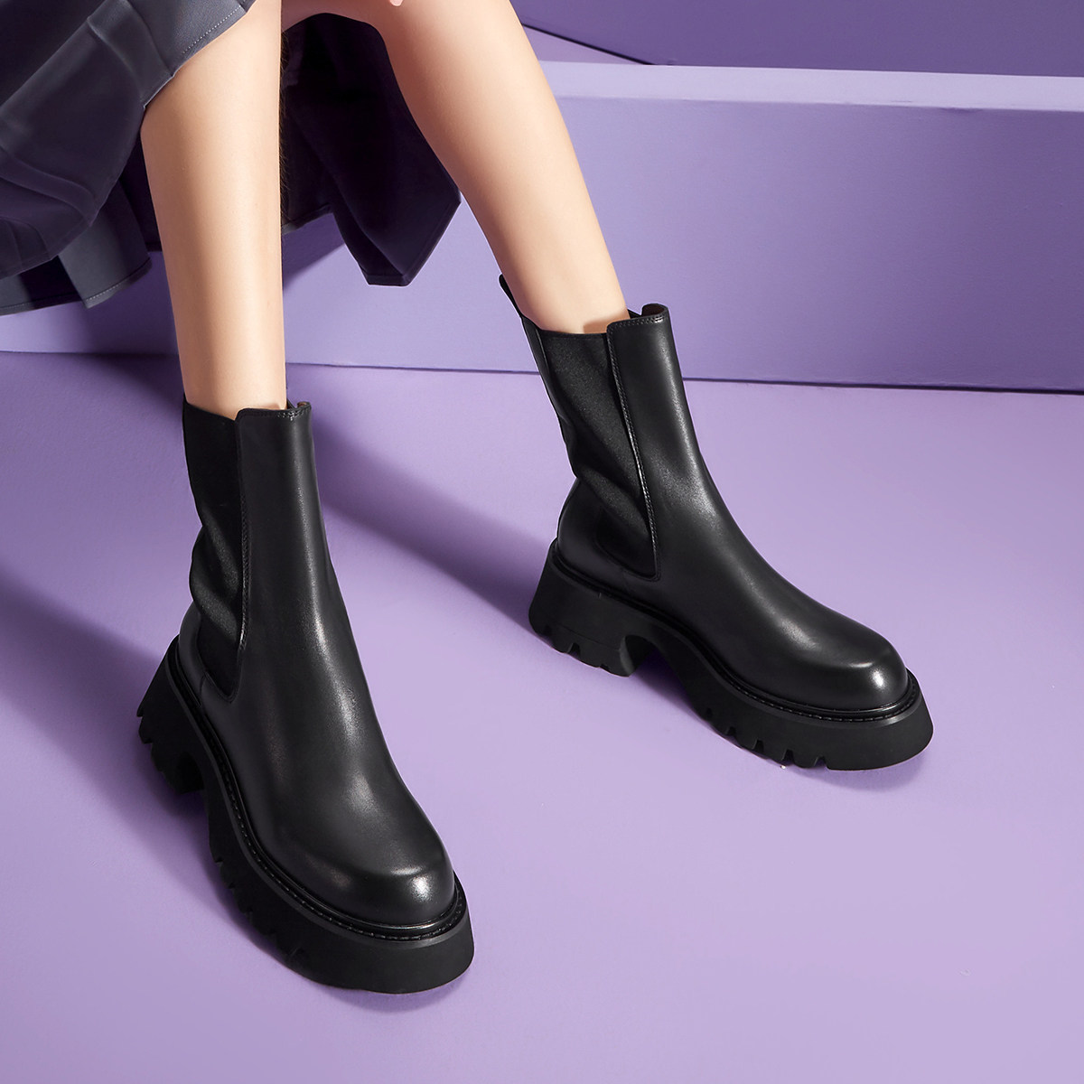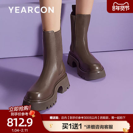 意尔康复古烟筒靴女靴2025冬靴子女深色切尔西靴英伦风时尚短靴