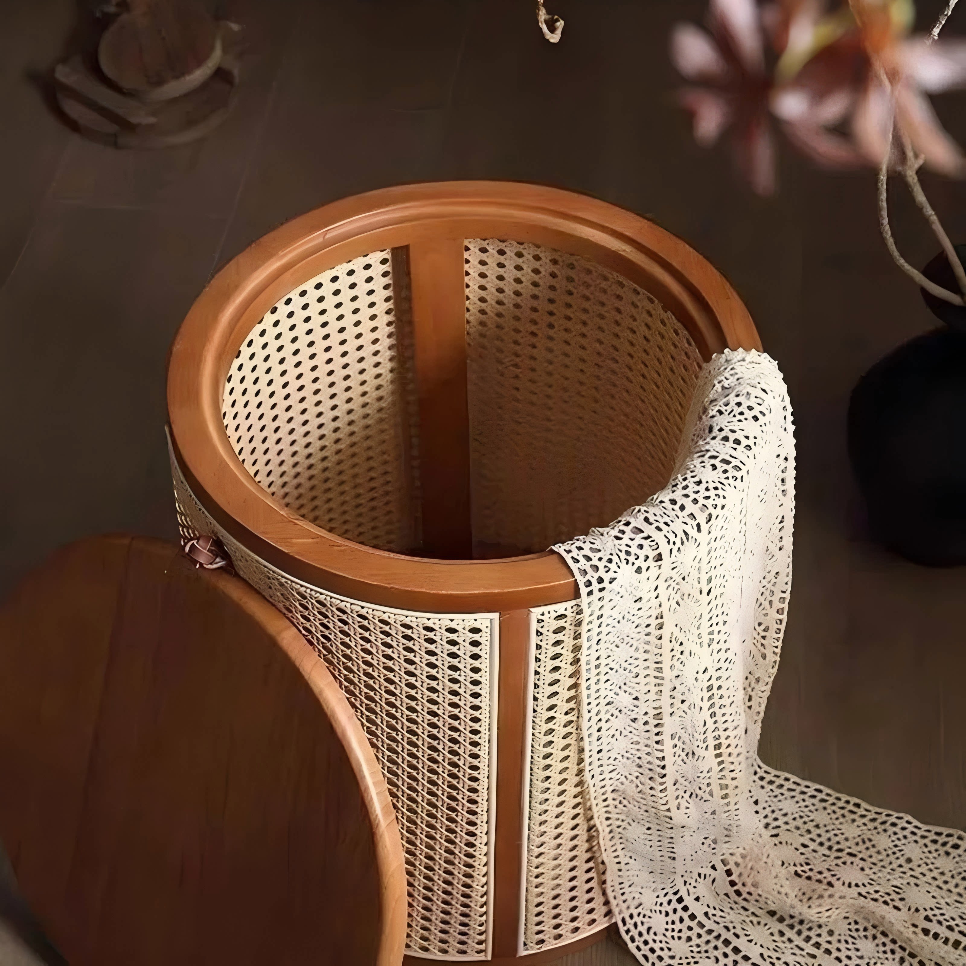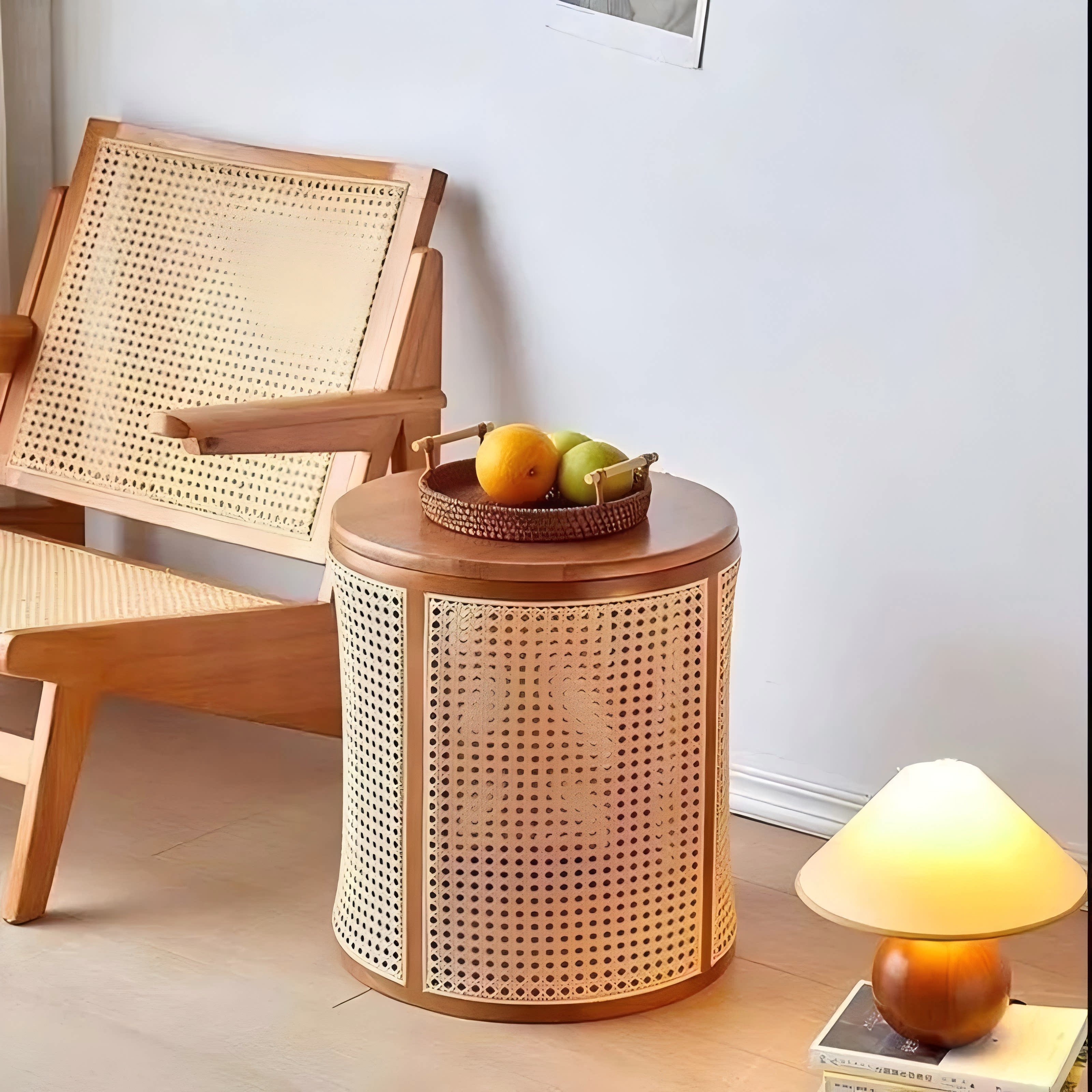 藤编床头收纳柜侘寂风小实木边几凳圆形置物架卧室小型编织脏衣篓