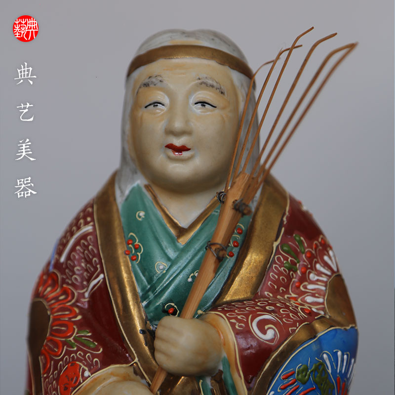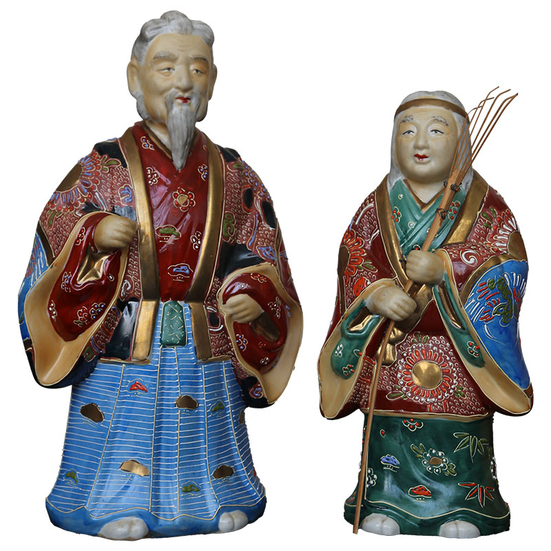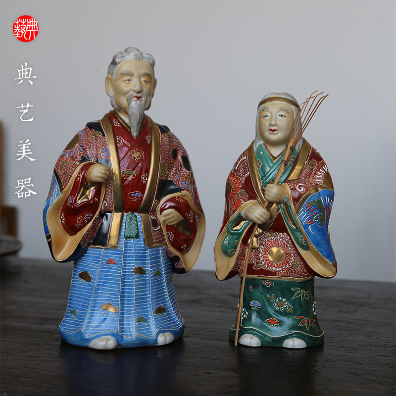 日本九谷陶和高砂夫妇立体人物摆件置物长寿招财幸运爱情原盒共箱