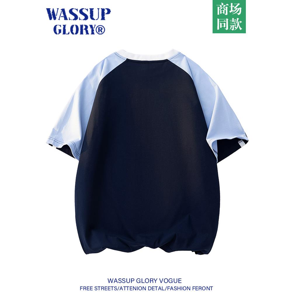 WASSUP GLORY潮牌短袖t恤男夏季美式复古撞色拼接上衣休闲情侣装