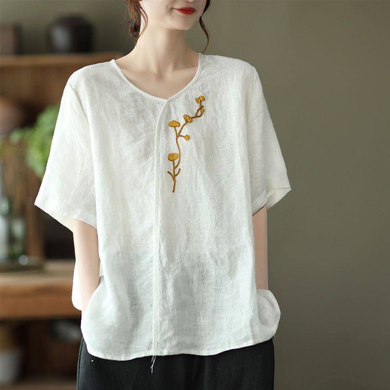 大码女装胖mm苎麻短袖T恤夏季棉麻上衣刺绣中老年妈妈装宽松衬衫