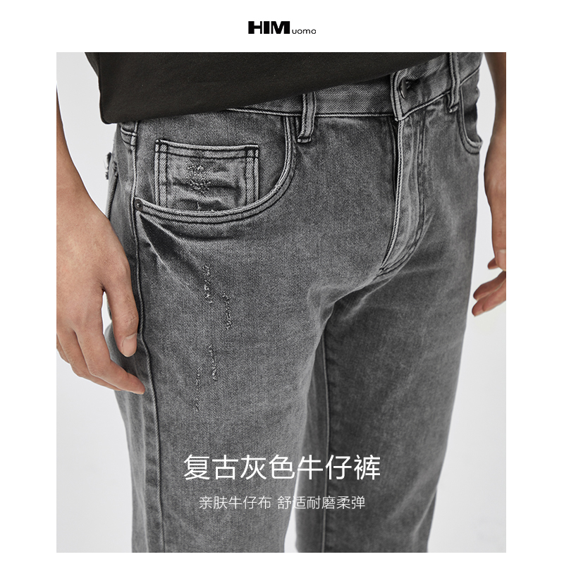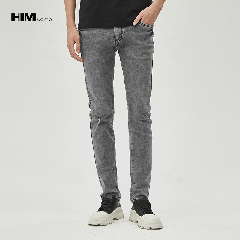 HIM汉崇 破洞洗水牛仔裤男潮流百搭高端简约修身小脚裤 2025夏季
