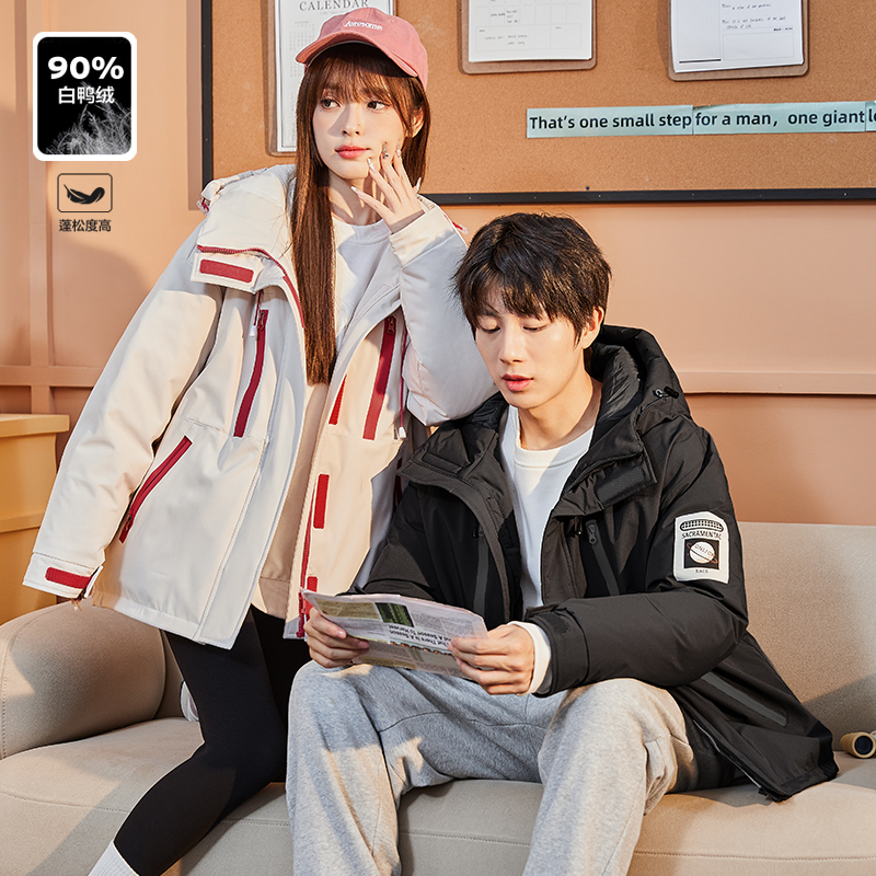 唐狮情侣羽绒服男工装冬季新款短款冲锋连帽撞色加厚外套衣服上衣