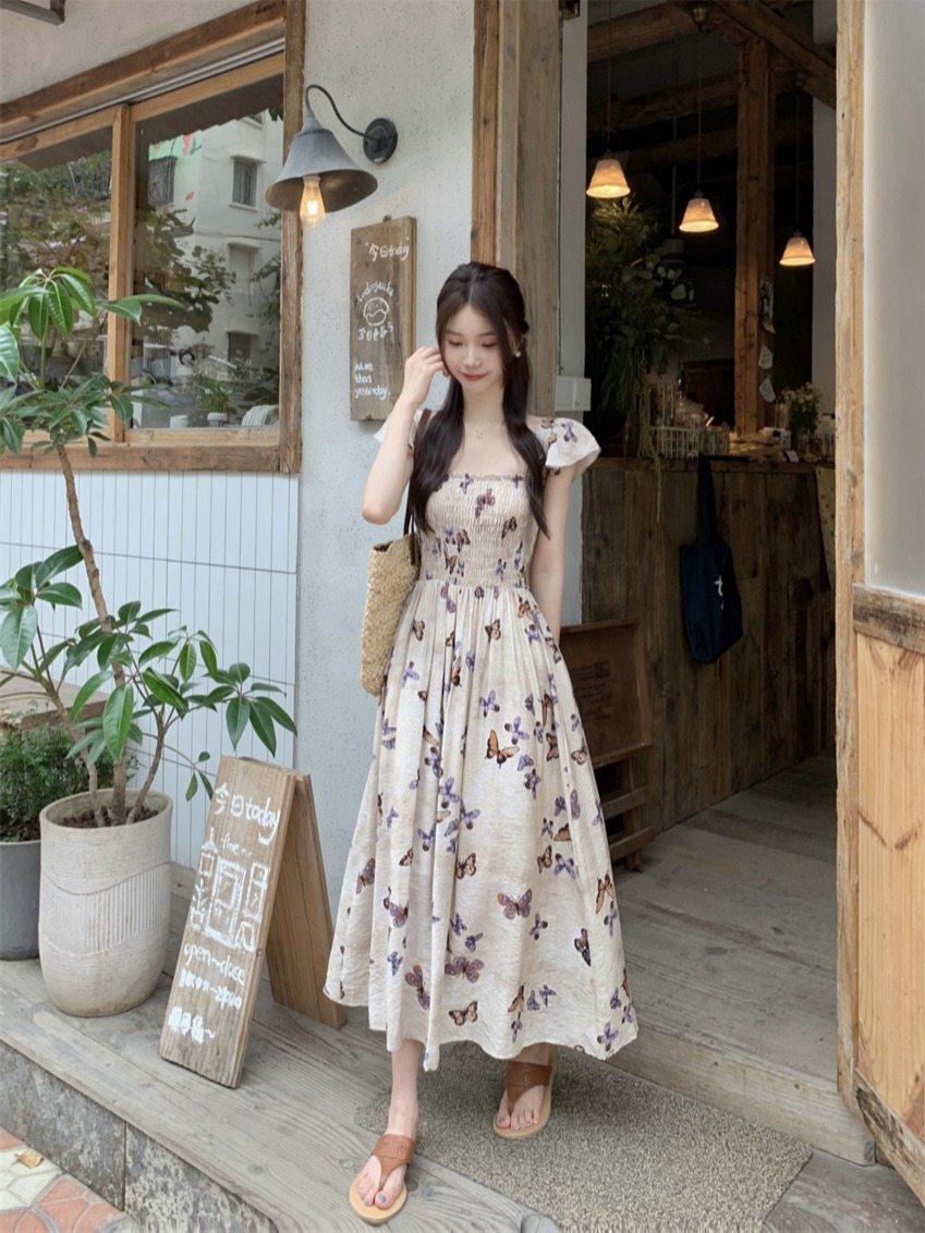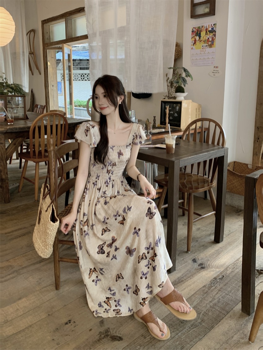 实拍 小蝴蝶中长裙春夏季新款a字收腰显瘦方领印花蛋糕裙连衣裙女