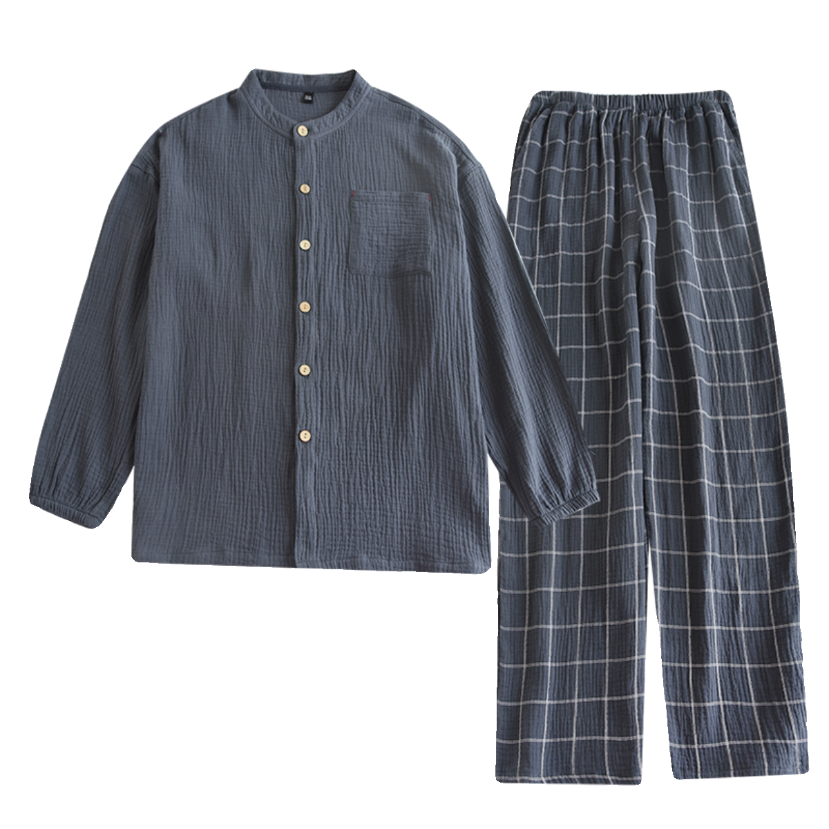 简约睡衣男春秋夏季纯棉纱布双层绉布长袖开衫宽松大码家居服套装