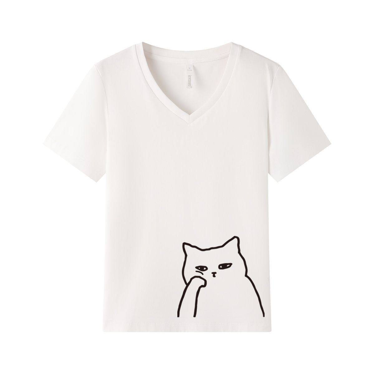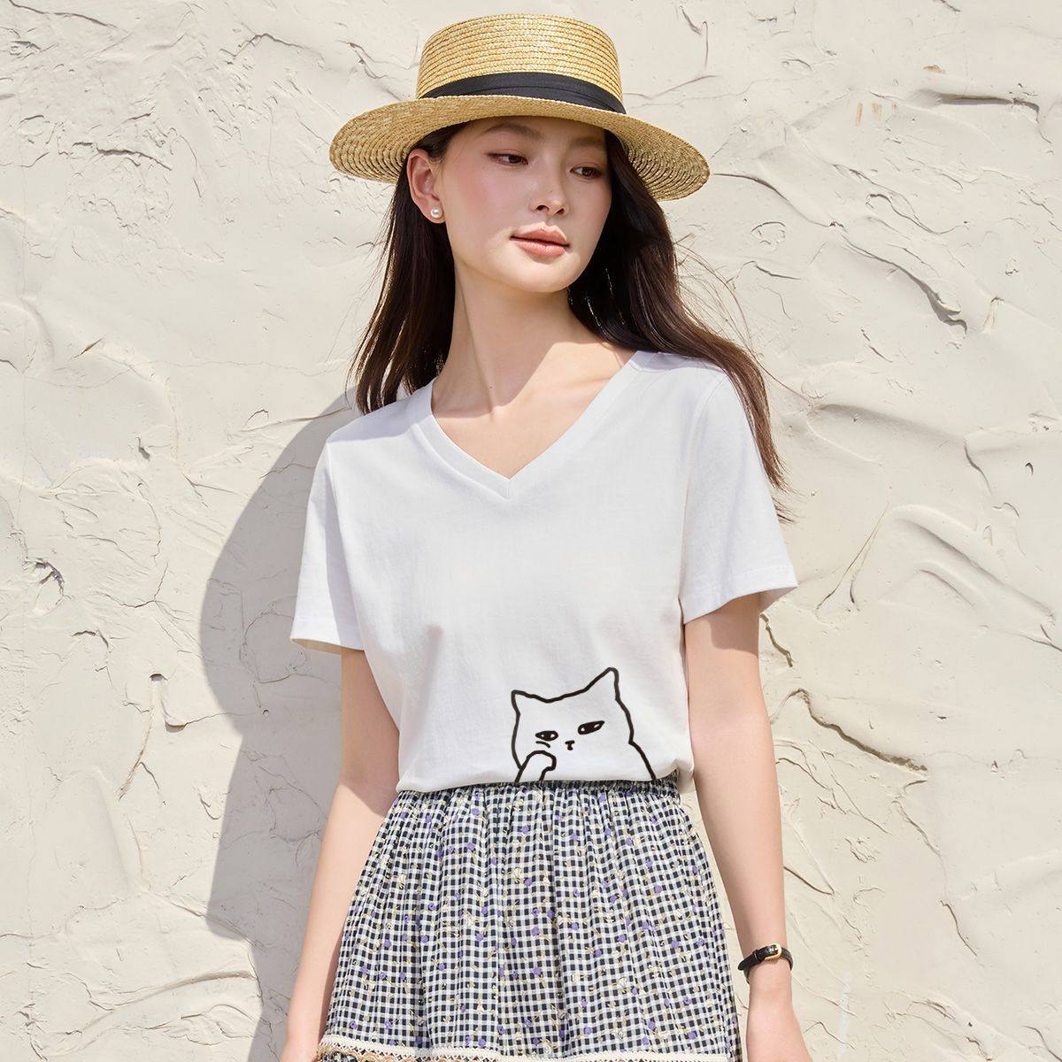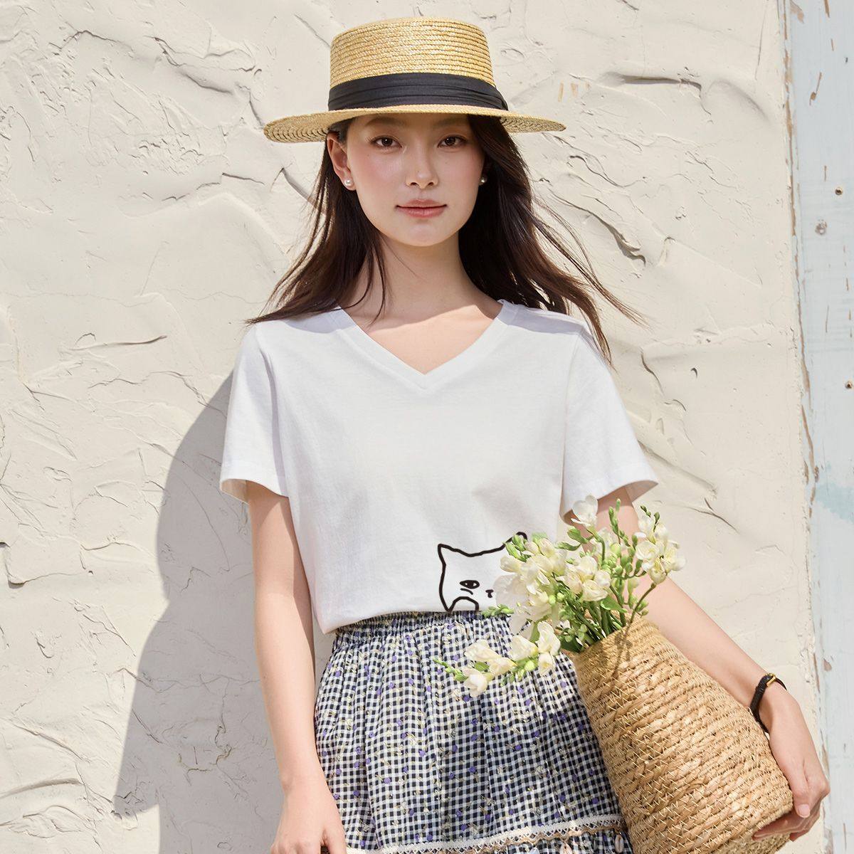 茵曼【100%棉】2025年夏季可爱减龄休闲正肩V领短袖T恤女