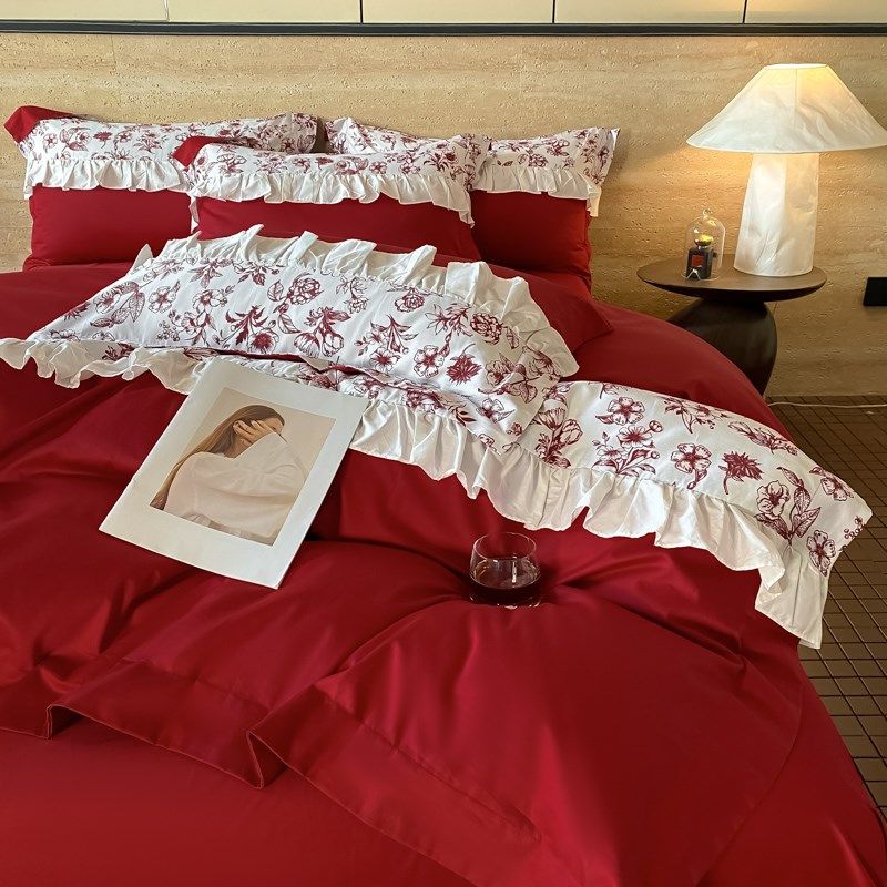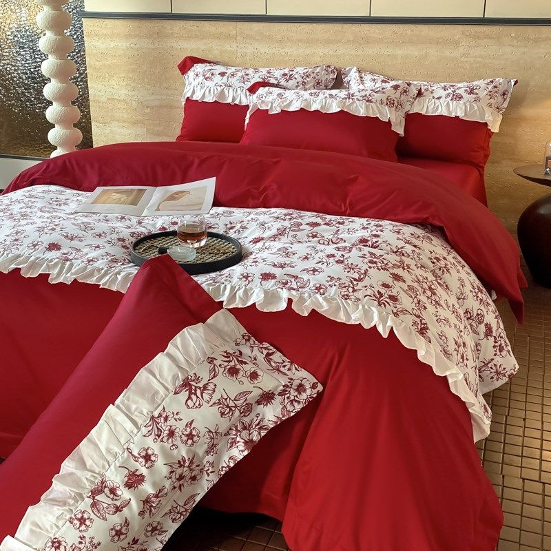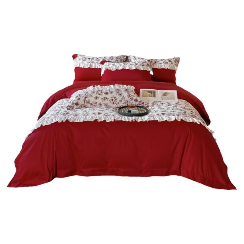 法式100支长绒棉婚庆四件套大红色喜被床单结婚床上用品婚嫁