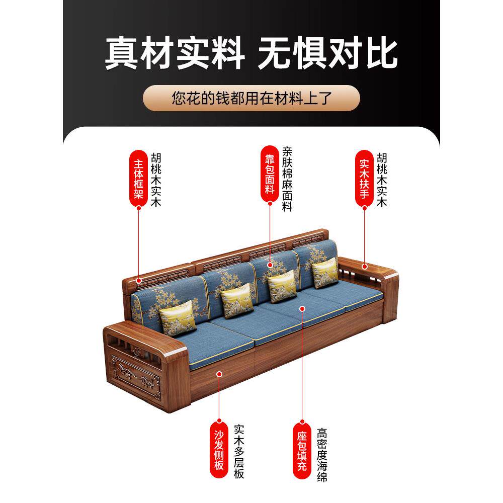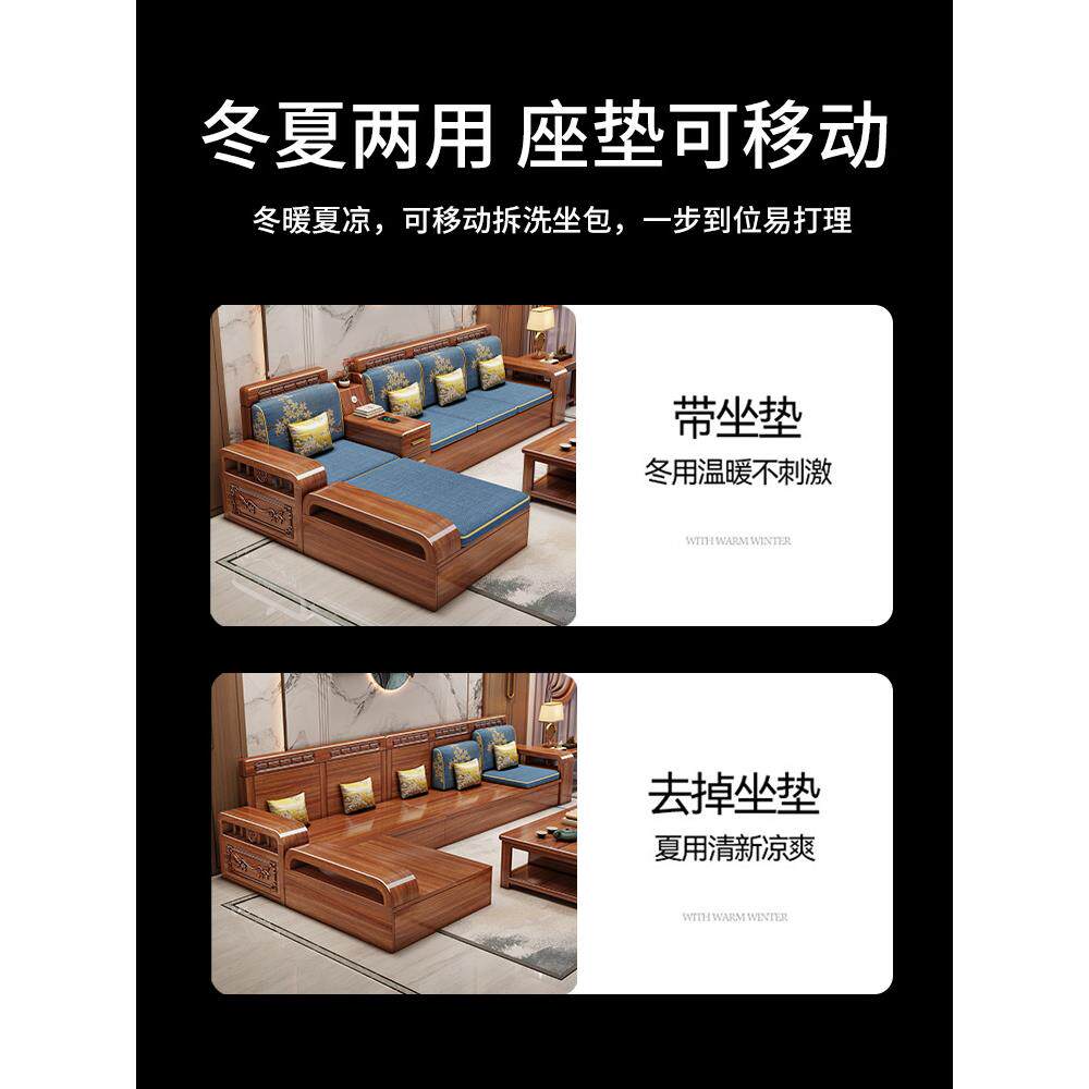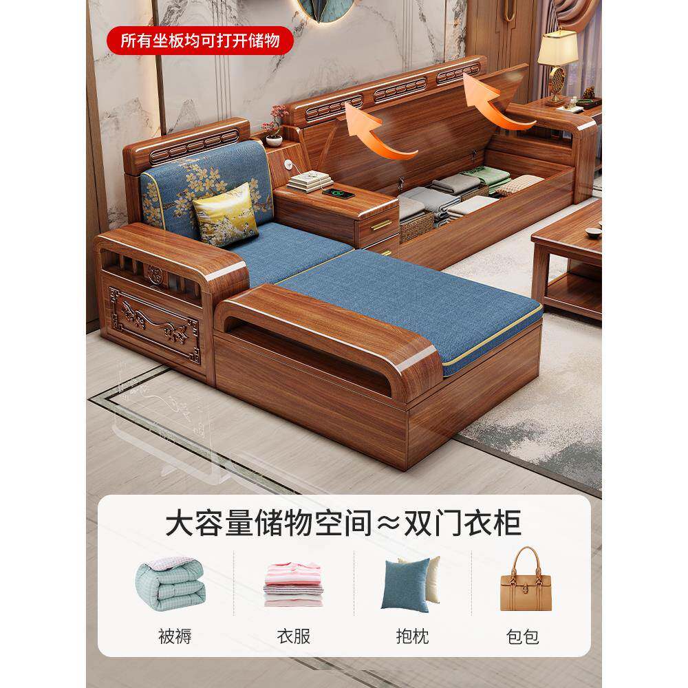 中式胡桃木实木沙发客厅现代简约小户型家用直排储物沙发茶几组合