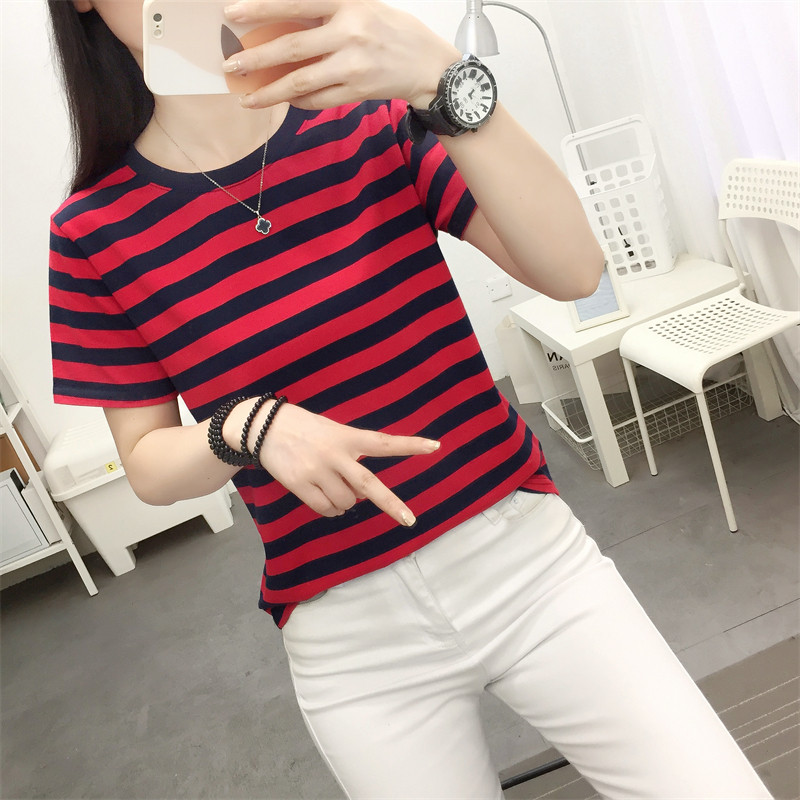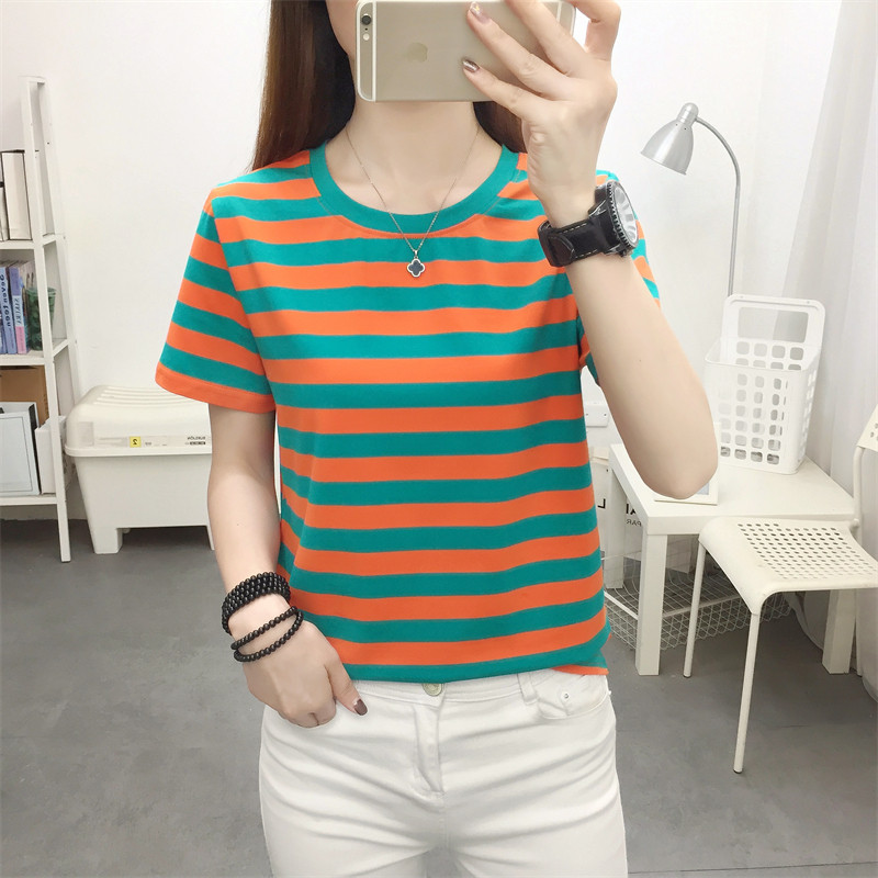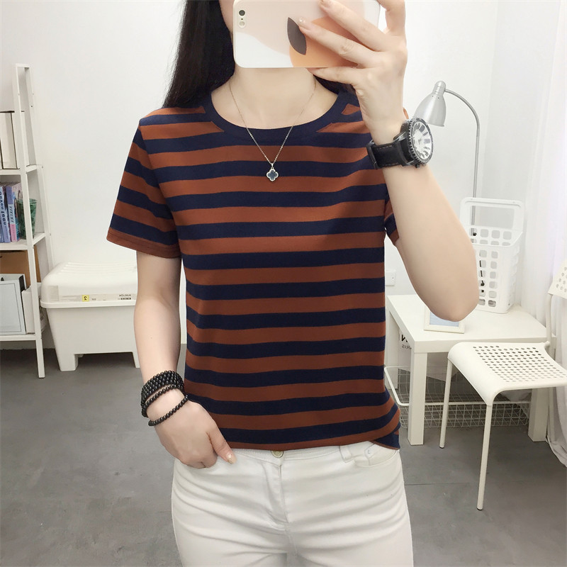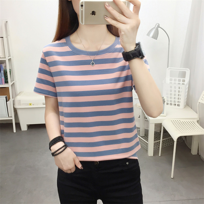 韩版胖mm大码宽松纯棉短袖T恤女装200斤夏装中年妈妈条纹上衣洋气