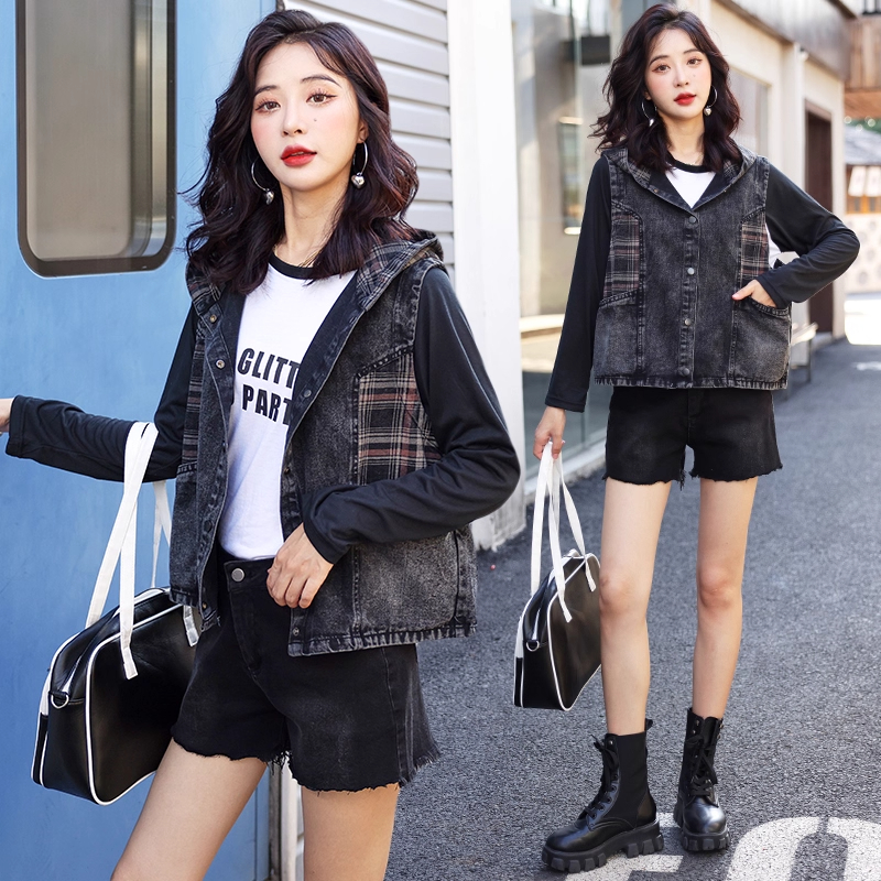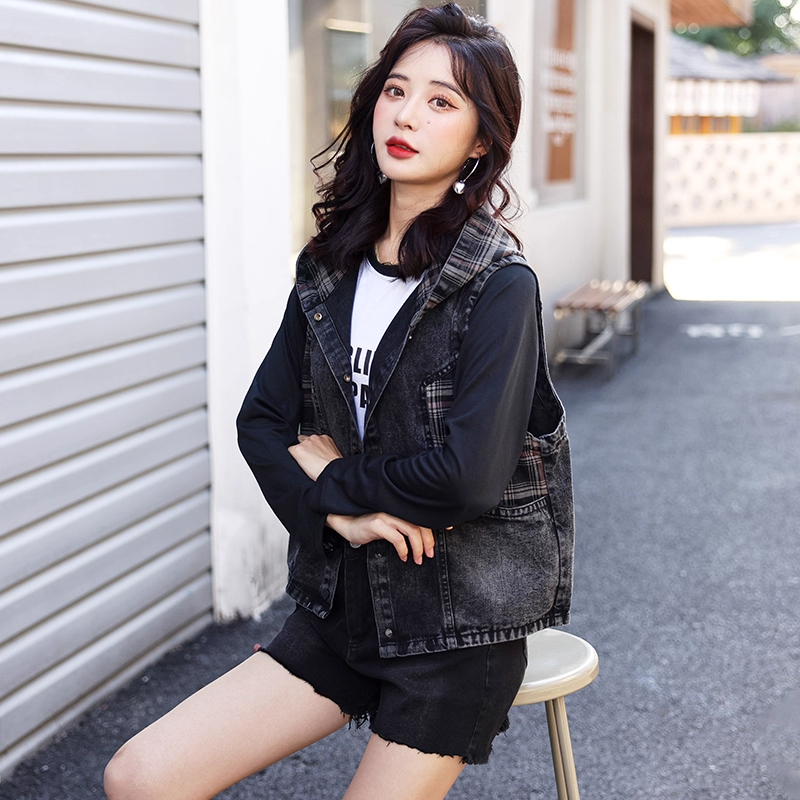 牛仔马甲女2025春秋薄款韩版宽松大码口袋格子连帽坎肩背心短外套