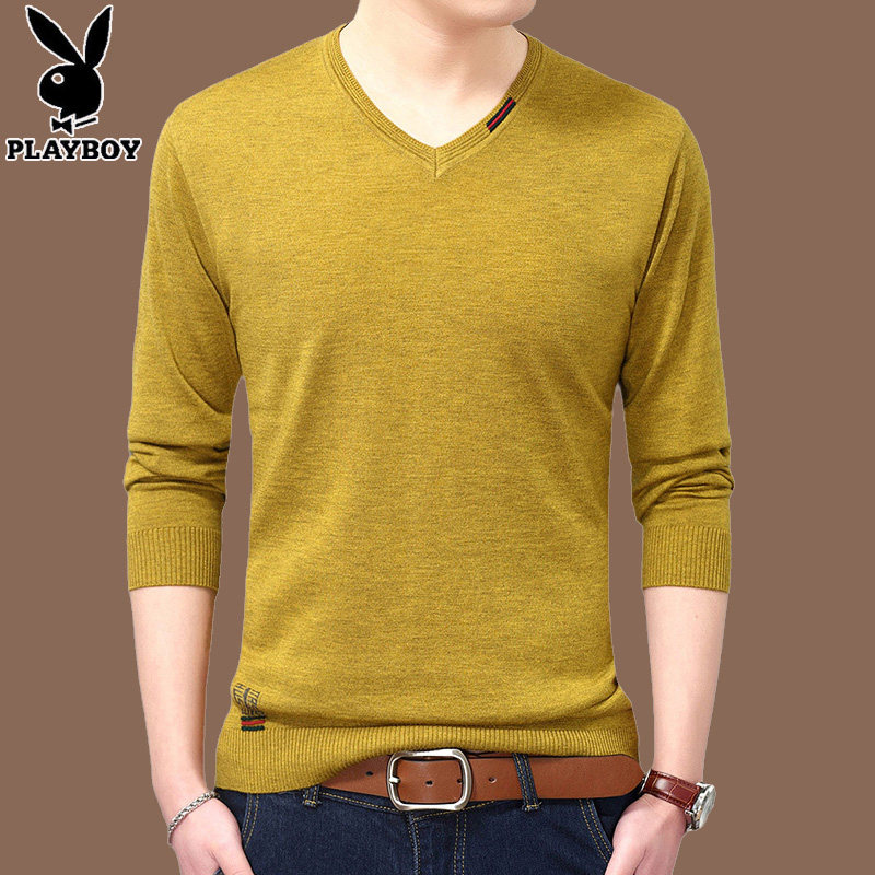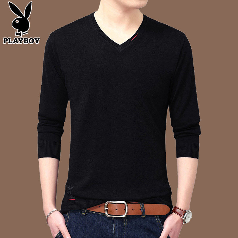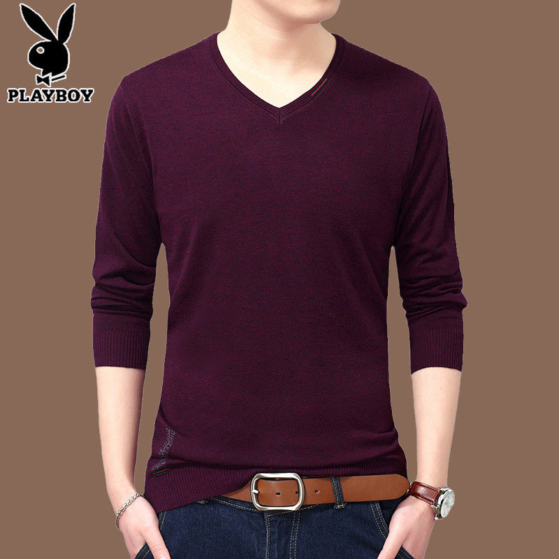 花花公子春秋季薄款男士长袖T恤v领宽松上衣爸爸装休闲针织打底衫