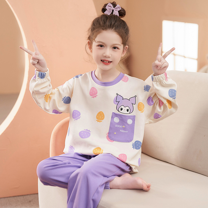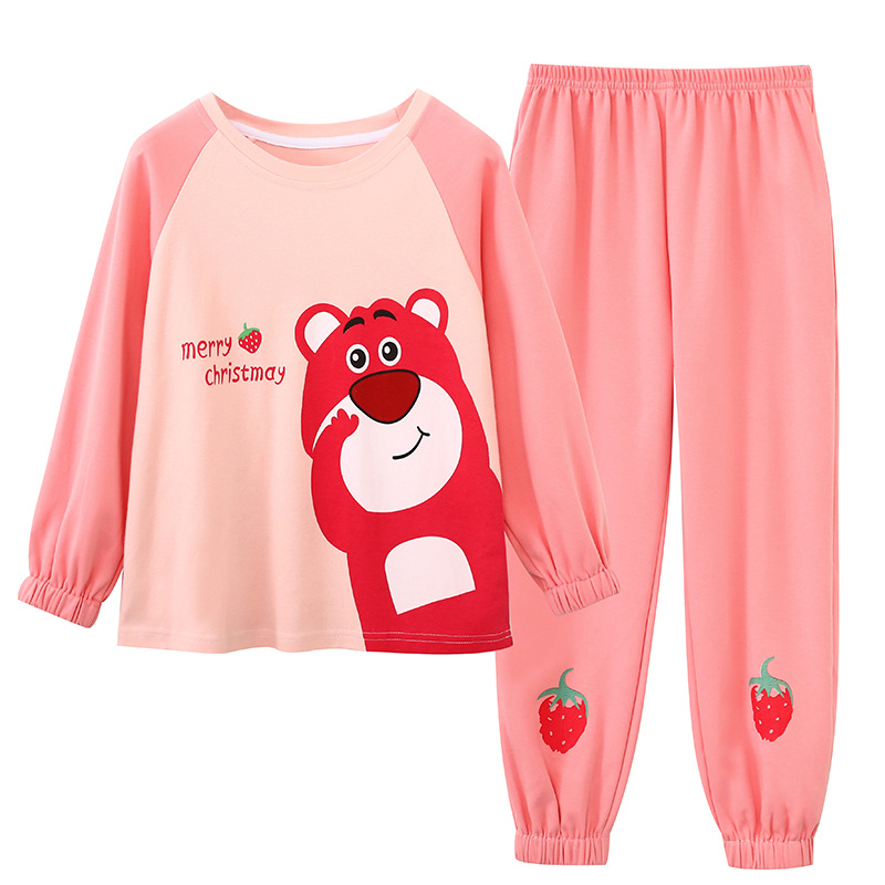 儿童睡衣春秋纯棉草莓熊卡通家居服长袖束口女孩薄款空调套装大童