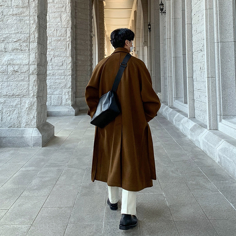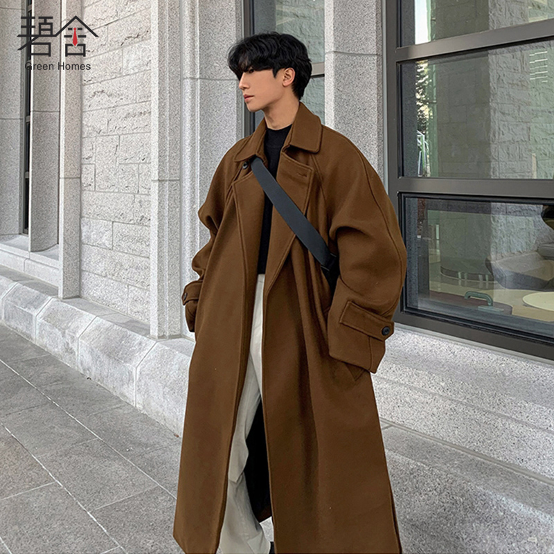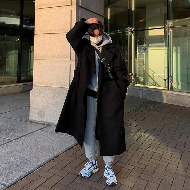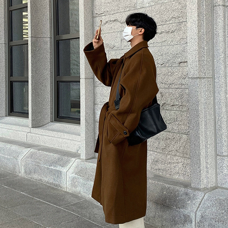 秋冬新款宽松过膝百搭毛呢呢子大衣系带风衣外套男中长版韩流潮牌