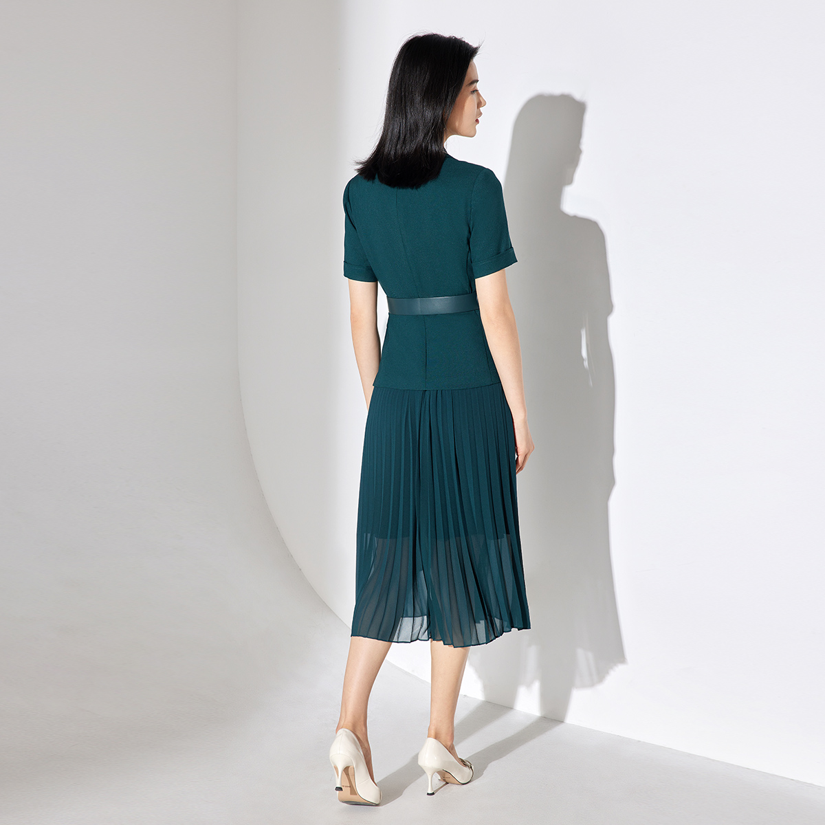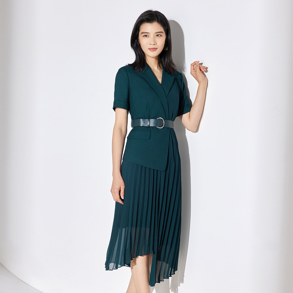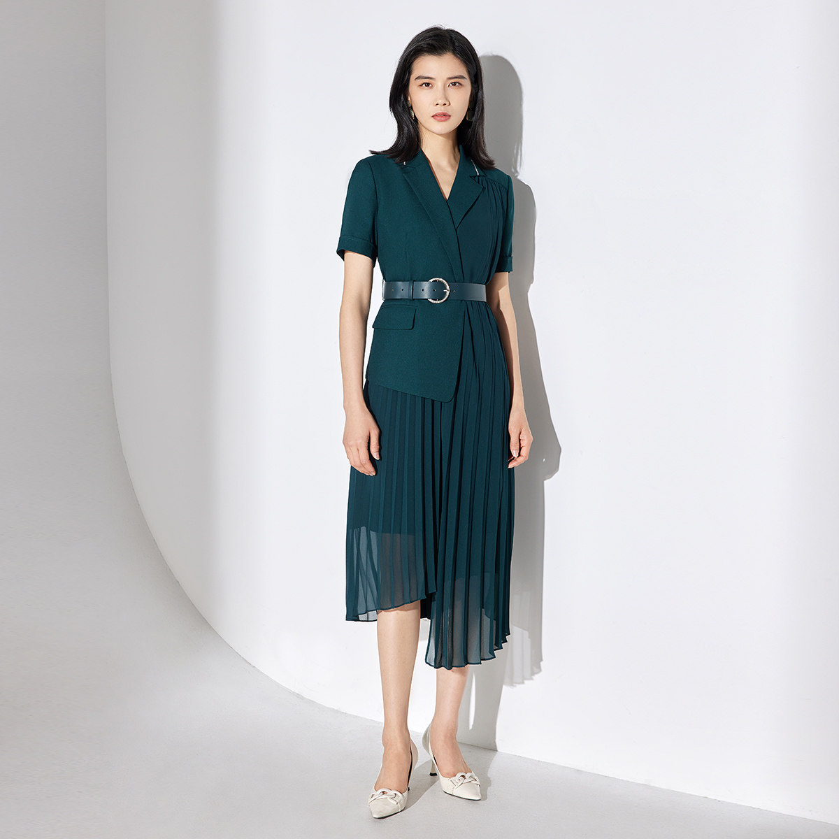 BBLLUUEE粉蓝衣橱解构感百褶假两件连衣裙女2025夏款西装百褶纱裙
