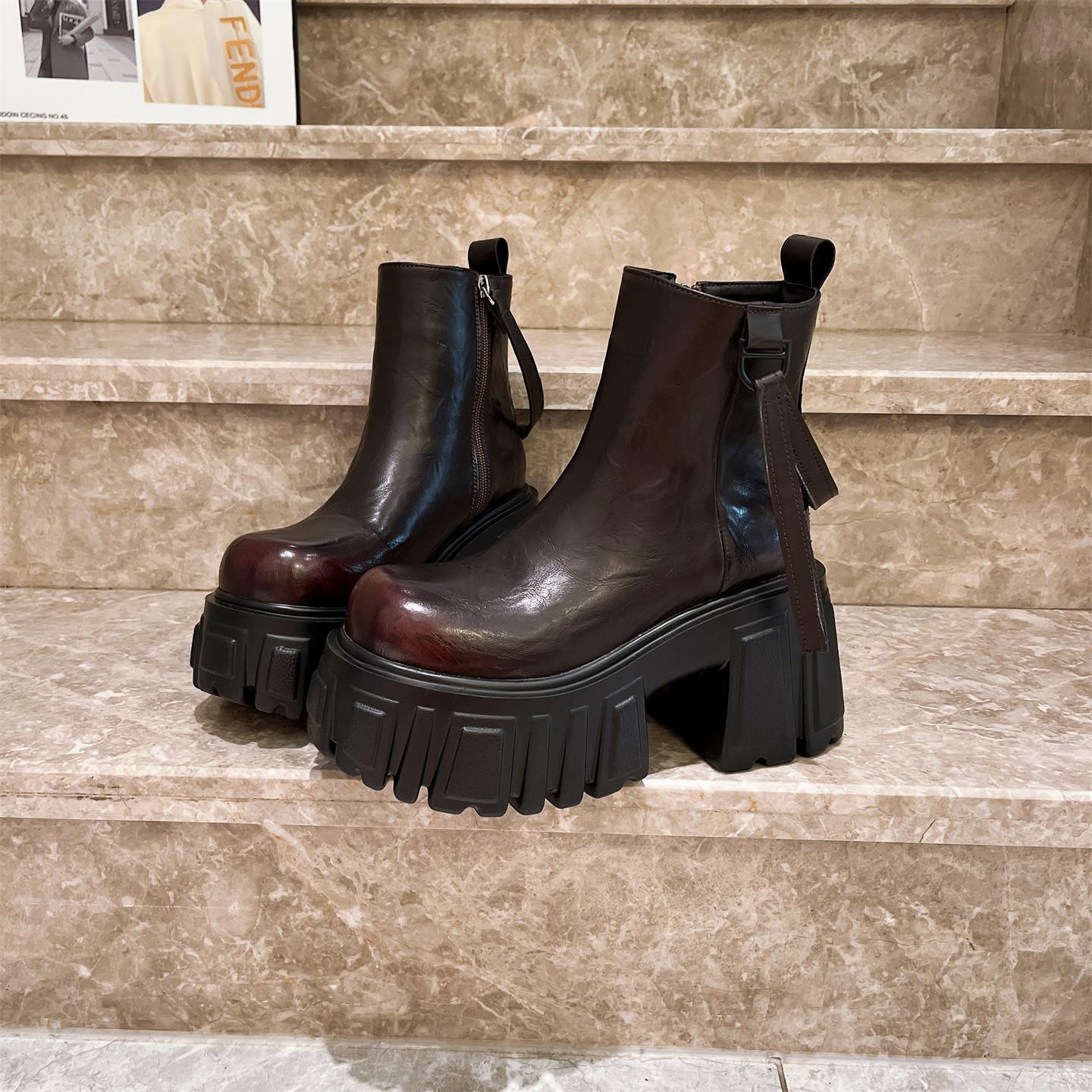 马丁靴女厚底松糕粗跟高跟后飘带小个子8cm机车靴短靴烟筒靴女鞋