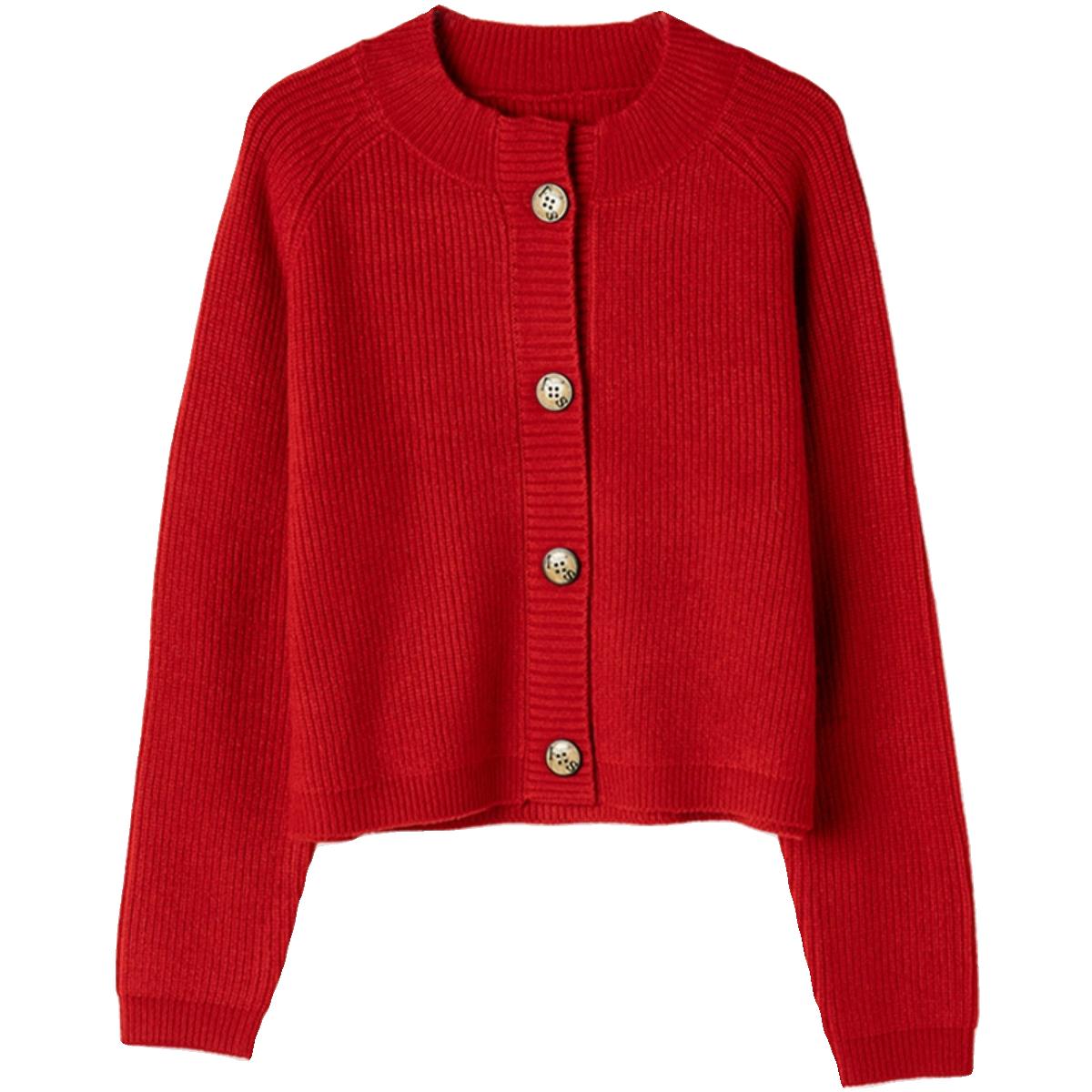 卡腰毛衣外套女春秋新款小个子配裙红色上衣外搭短款羊毛针织开衫