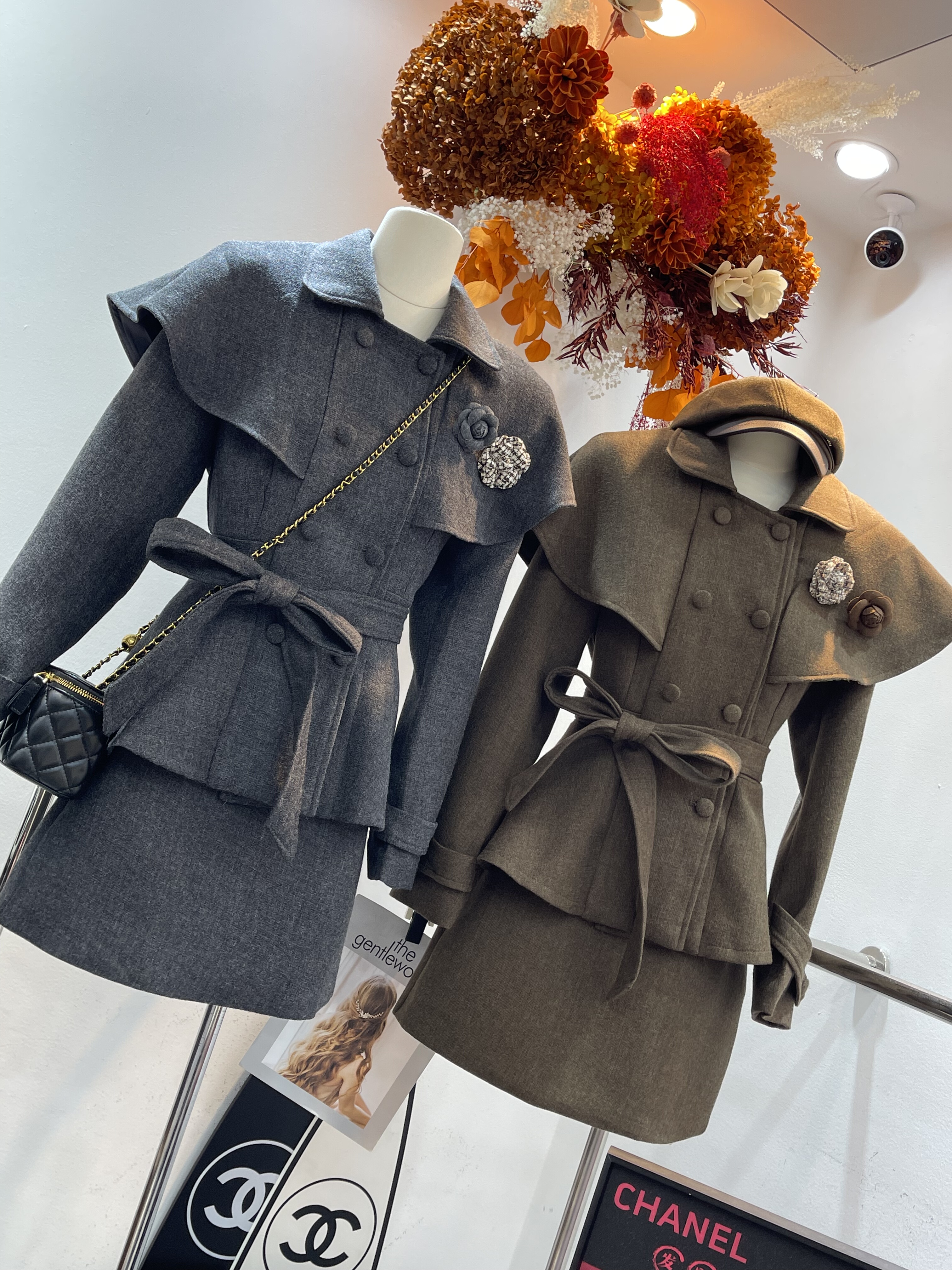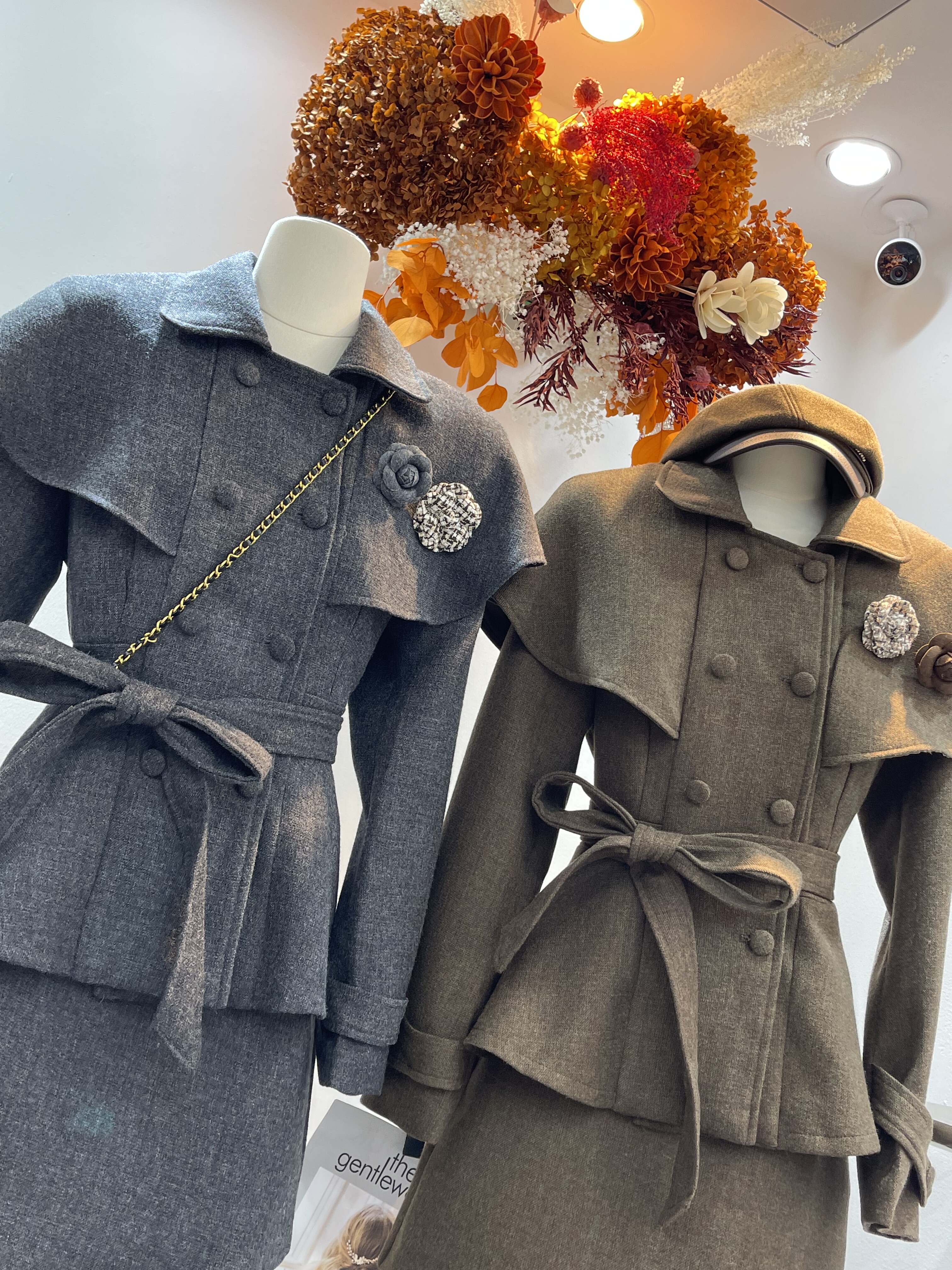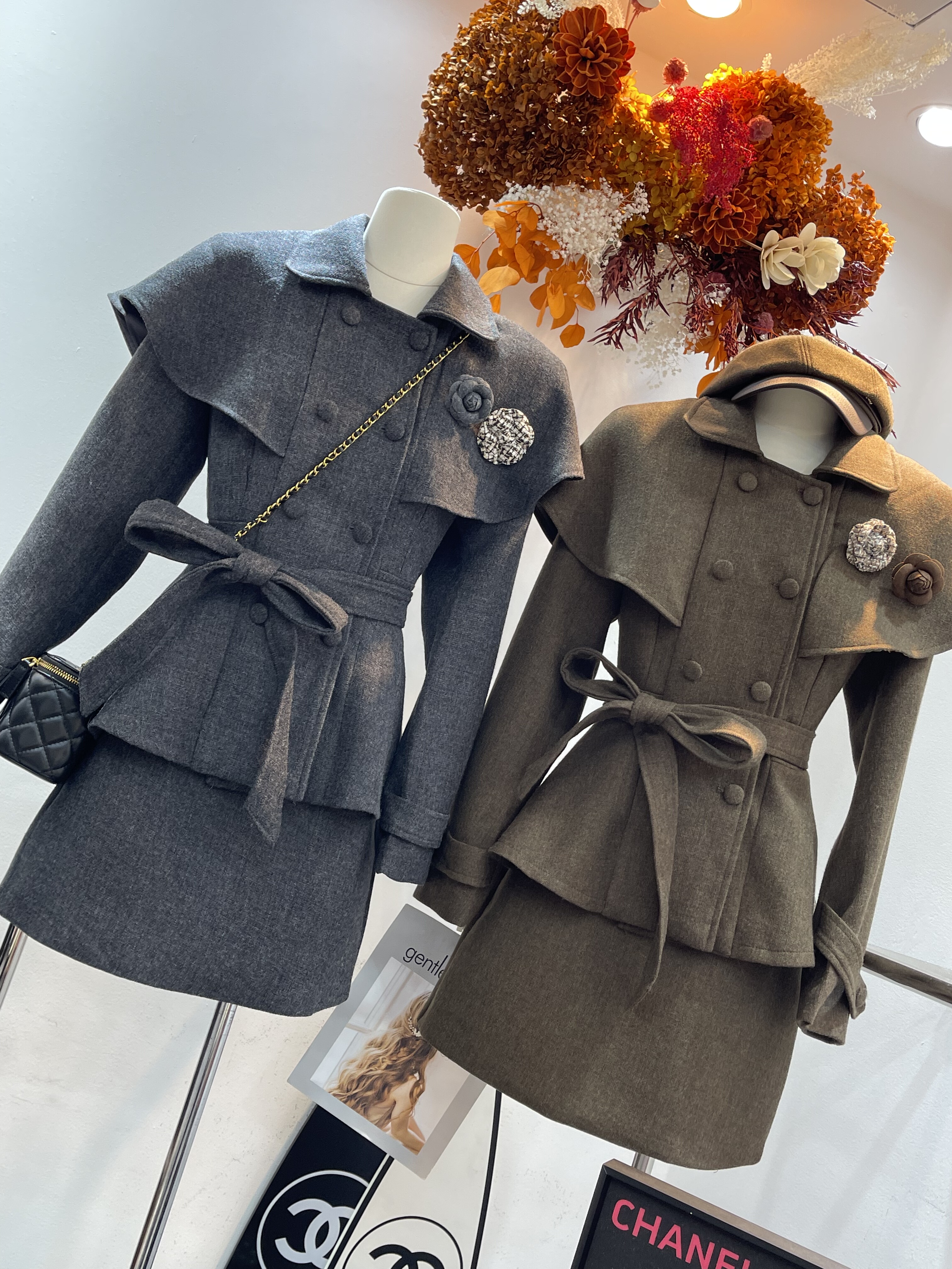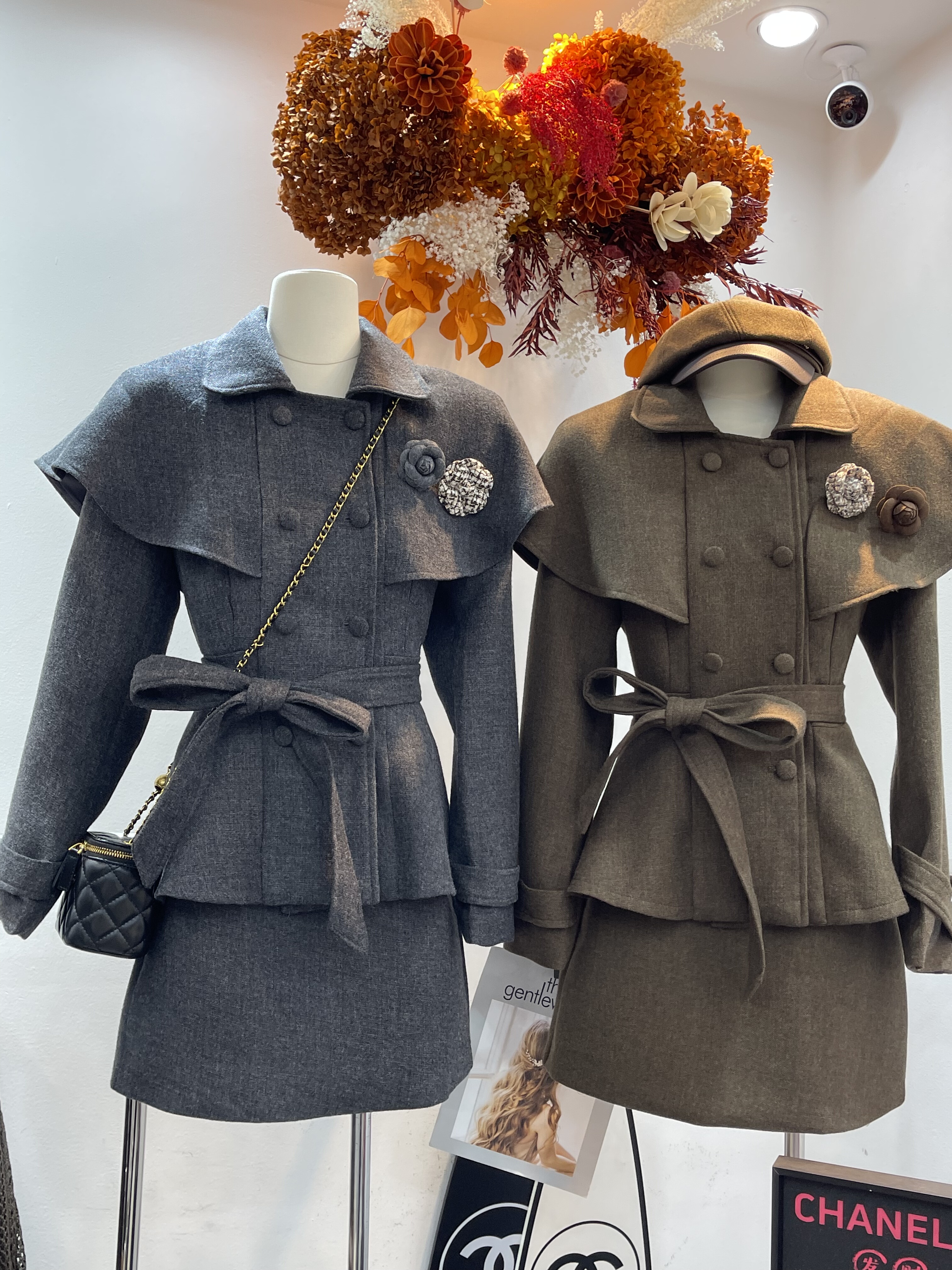 十三行2025秋季气质千金名媛斗篷山茶花系带收腰西装外套半裙套装