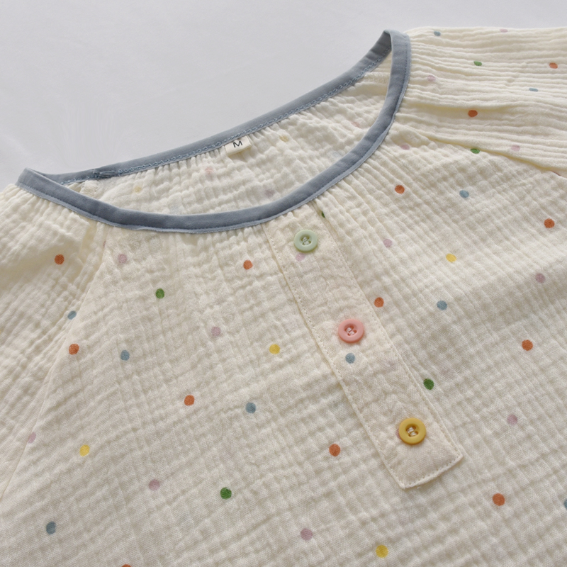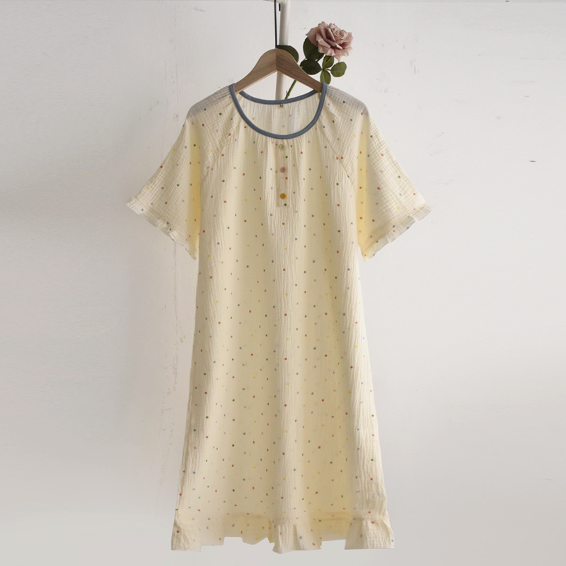 彩色圆点荷叶边睡裙女士夏季纯棉纱布薄款宽松短袖家居服睡衣裙子