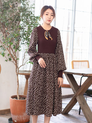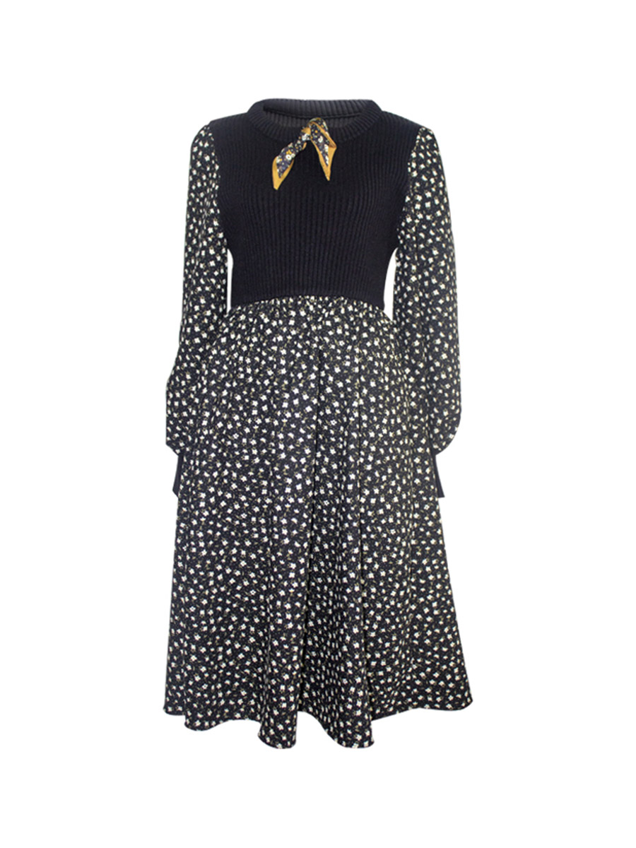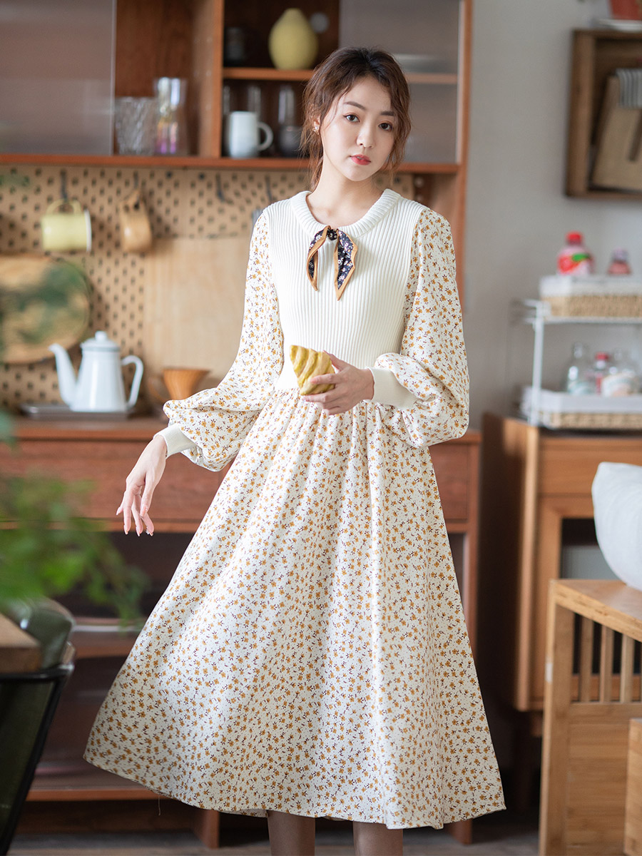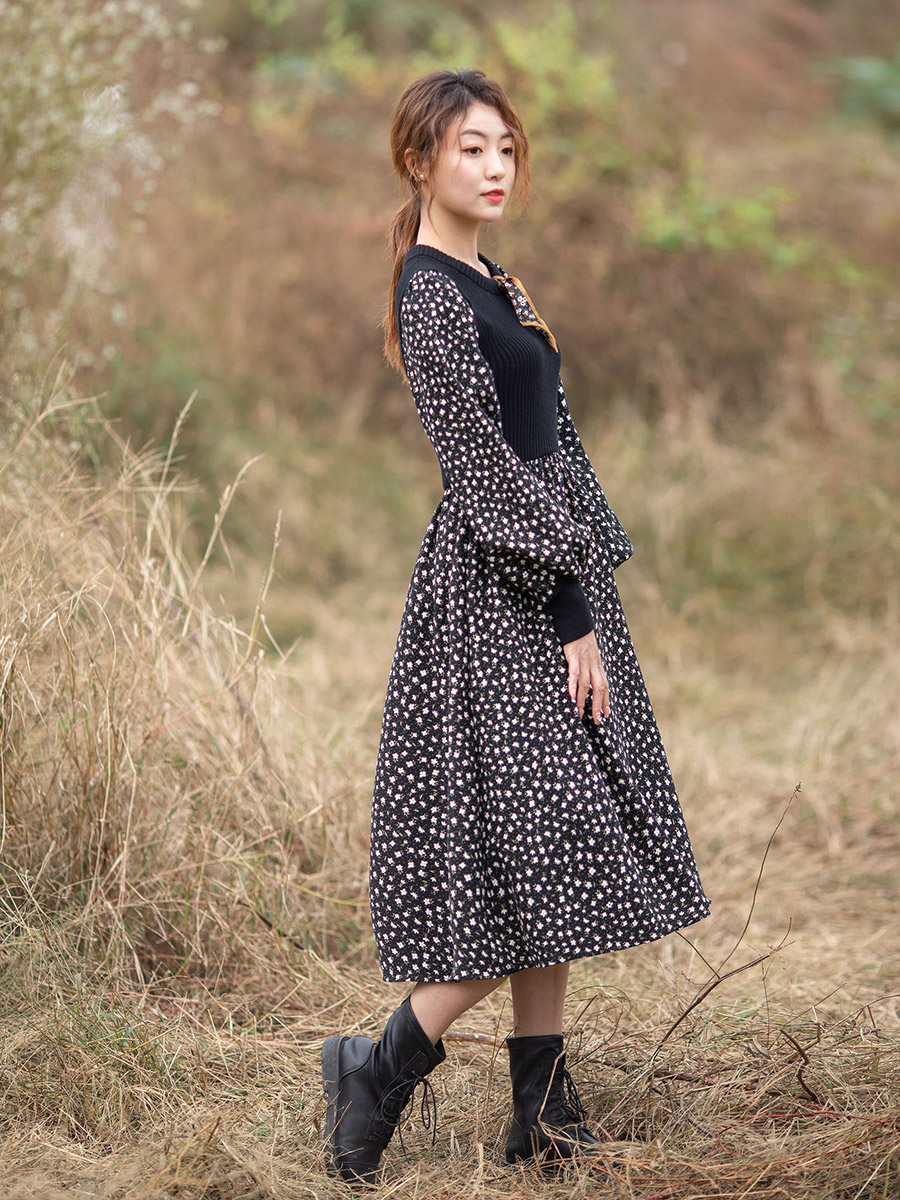 女装春秋长袖碎花毛衣连衣裙2025新款小众设计感气质收腰打底长裙