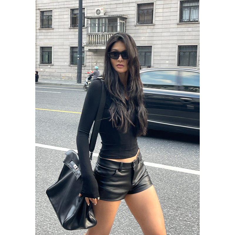 井也 辣妹黑色PU皮短裤女2023秋季新款高腰休闲直筒显瘦包臀热裤