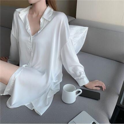 性感睡衣女夏季冰丝薄款男友风白衬衫中长款宽松大码真丝绸家居服
