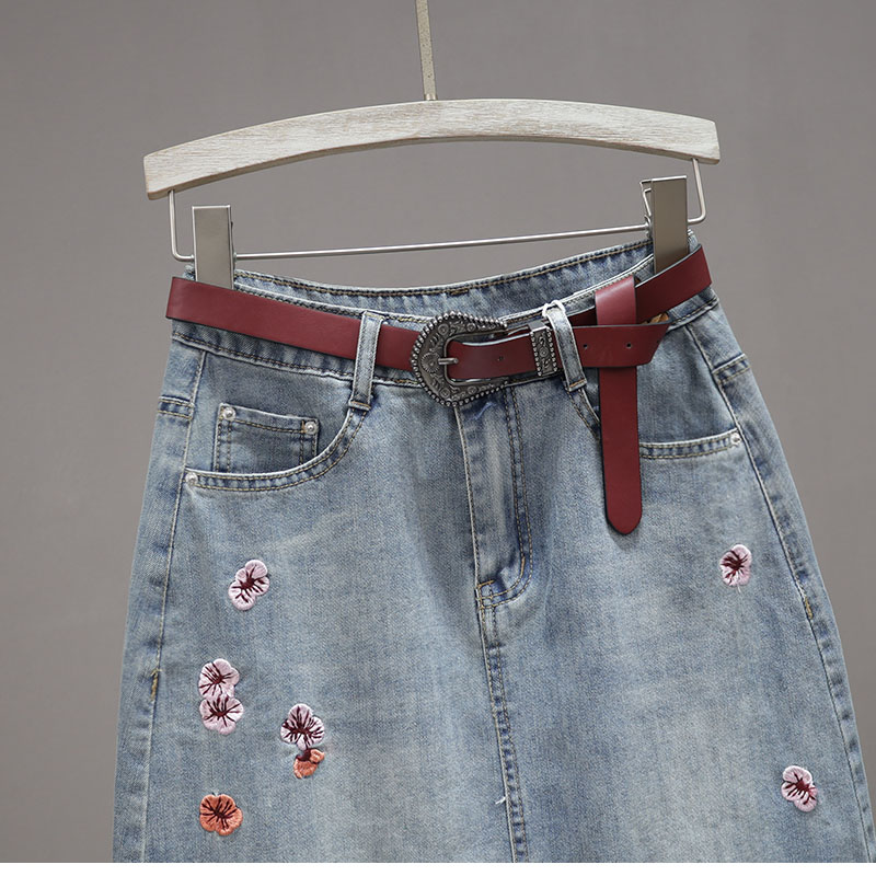 2024春夏中长款牛仔裙女刺绣欧货a字百搭后开叉半身裙显瘦包臀裙